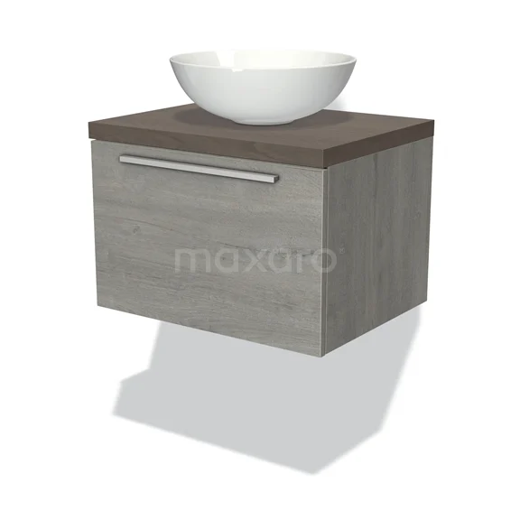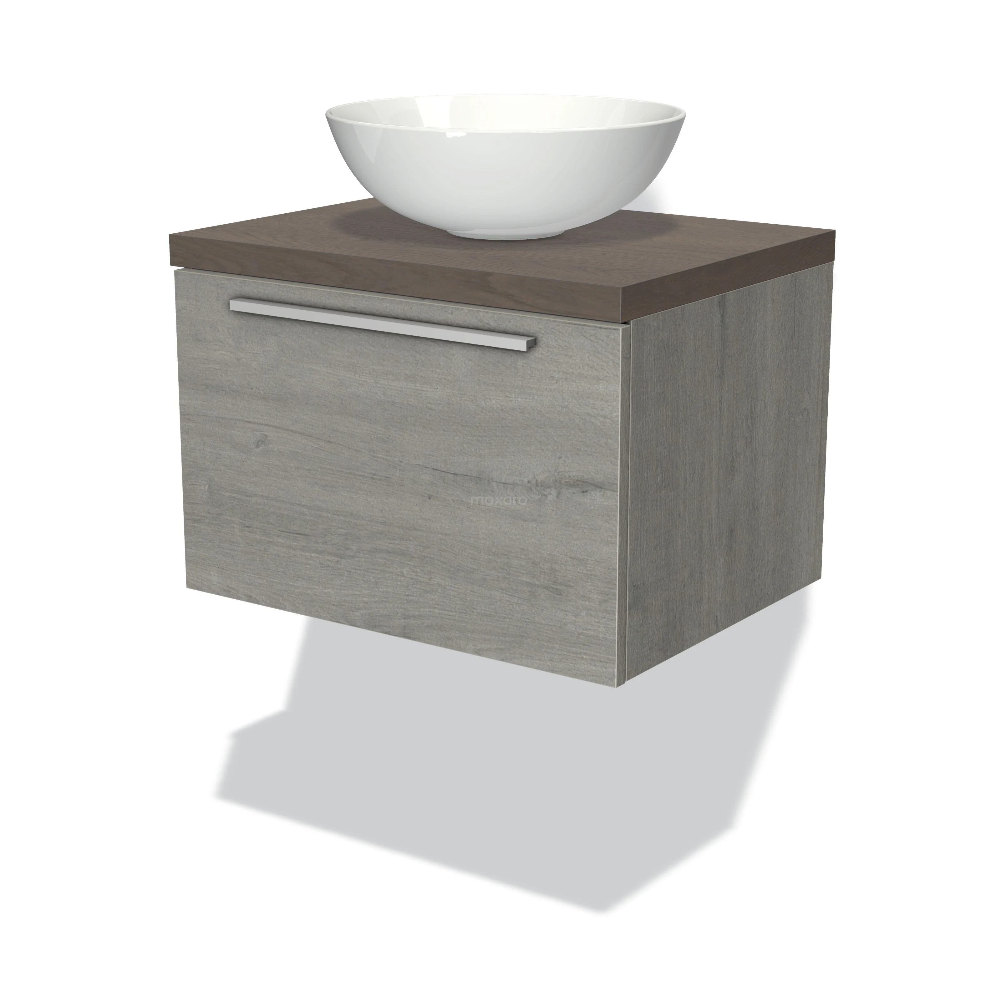 Modulo Plato Badmöbel mit Aufsatzwaschbecken | 60 cm Graue Eiche Flach front Dunkelbraune Eiche blatt 1 Schublade