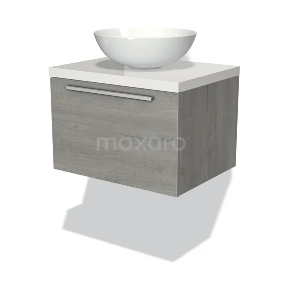 Modulo Plato Badmöbel mit Aufsatzwaschbecken | 60 cm Graue Eiche Flach front Hochglanz Weiß blatt 1 Schublade