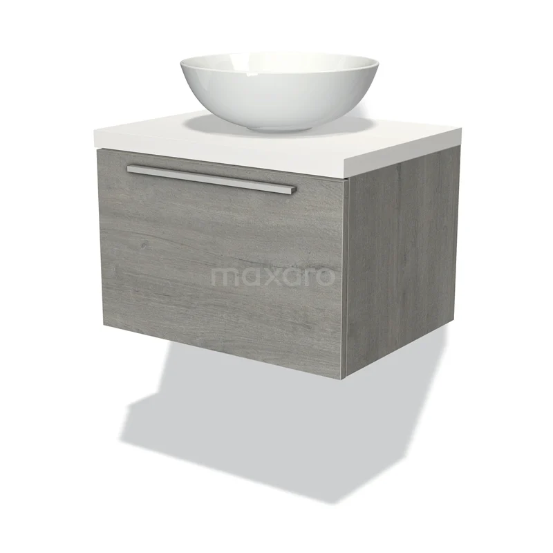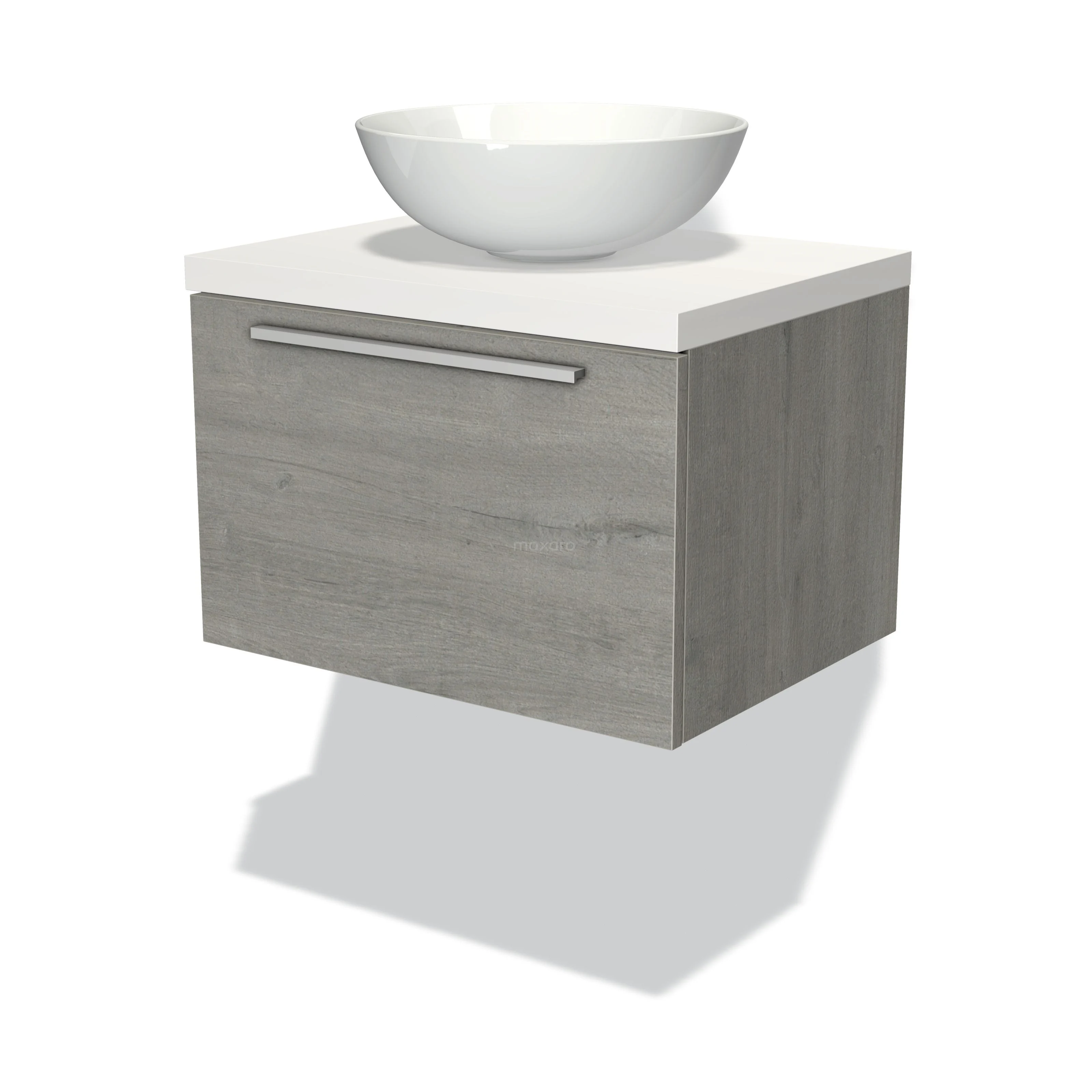 Modulo Plato Badmöbel mit Aufsatzwaschbecken | 60 cm Graue Eiche Flach front Matt Weiß blatt 1 Schublade