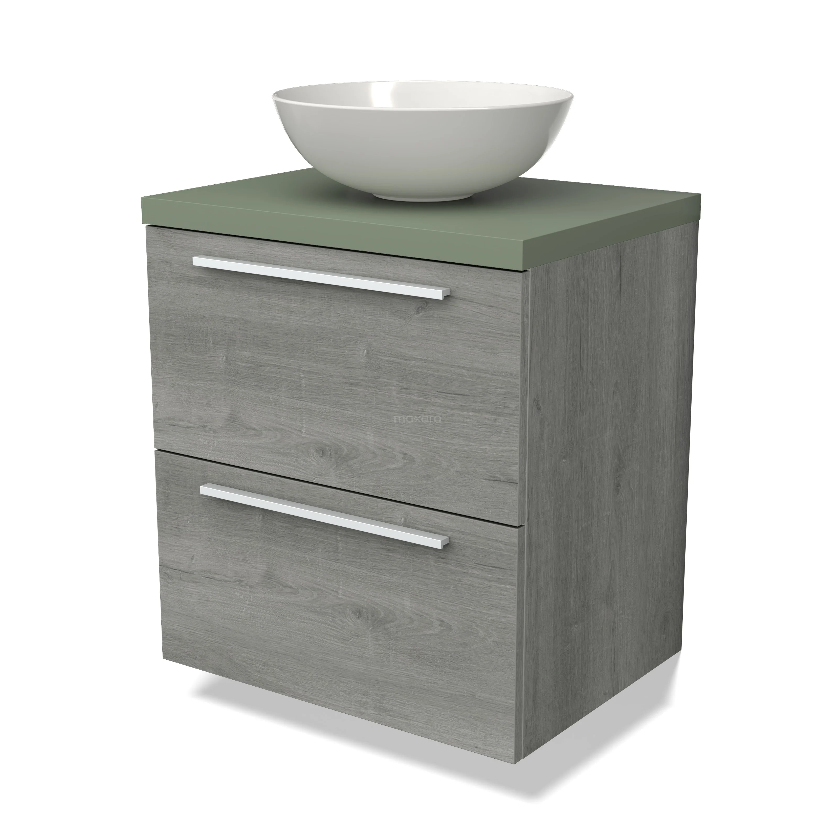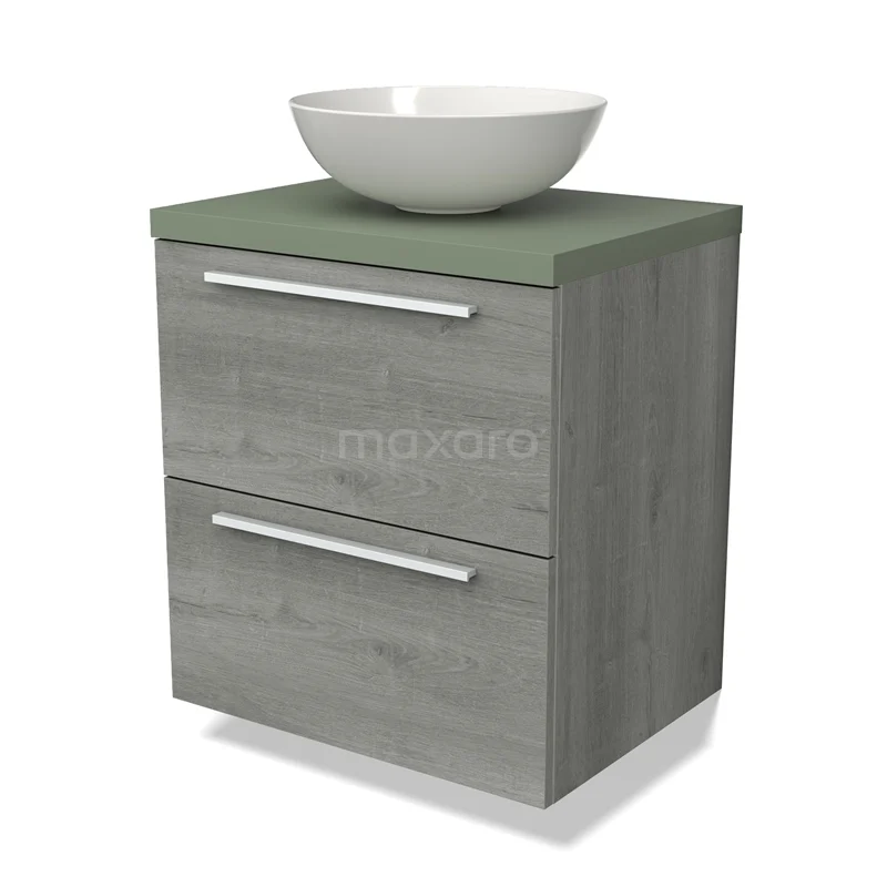 Modulo Plato Badmöbel mit Aufsatzwaschbecken | 60 cm Graue Eiche Flach front Salbeigrün blatt 2 übereinanderliegende Schubladen