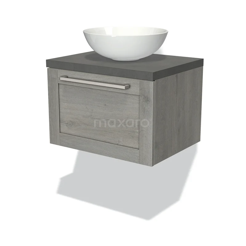 Modulo Plato Badmöbel mit Aufsatzwaschbecken | 60 cm Graue Eiche Rahmen front Dunkelgrauer Beton blatt 1 Schublade