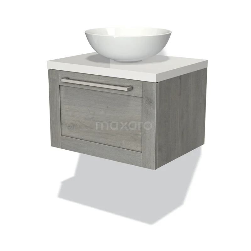 Modulo Plato Badmöbel mit Aufsatzwaschbecken | 60 cm Graue Eiche Rahmen front Hochglanz Weiß blatt 1 Schublade