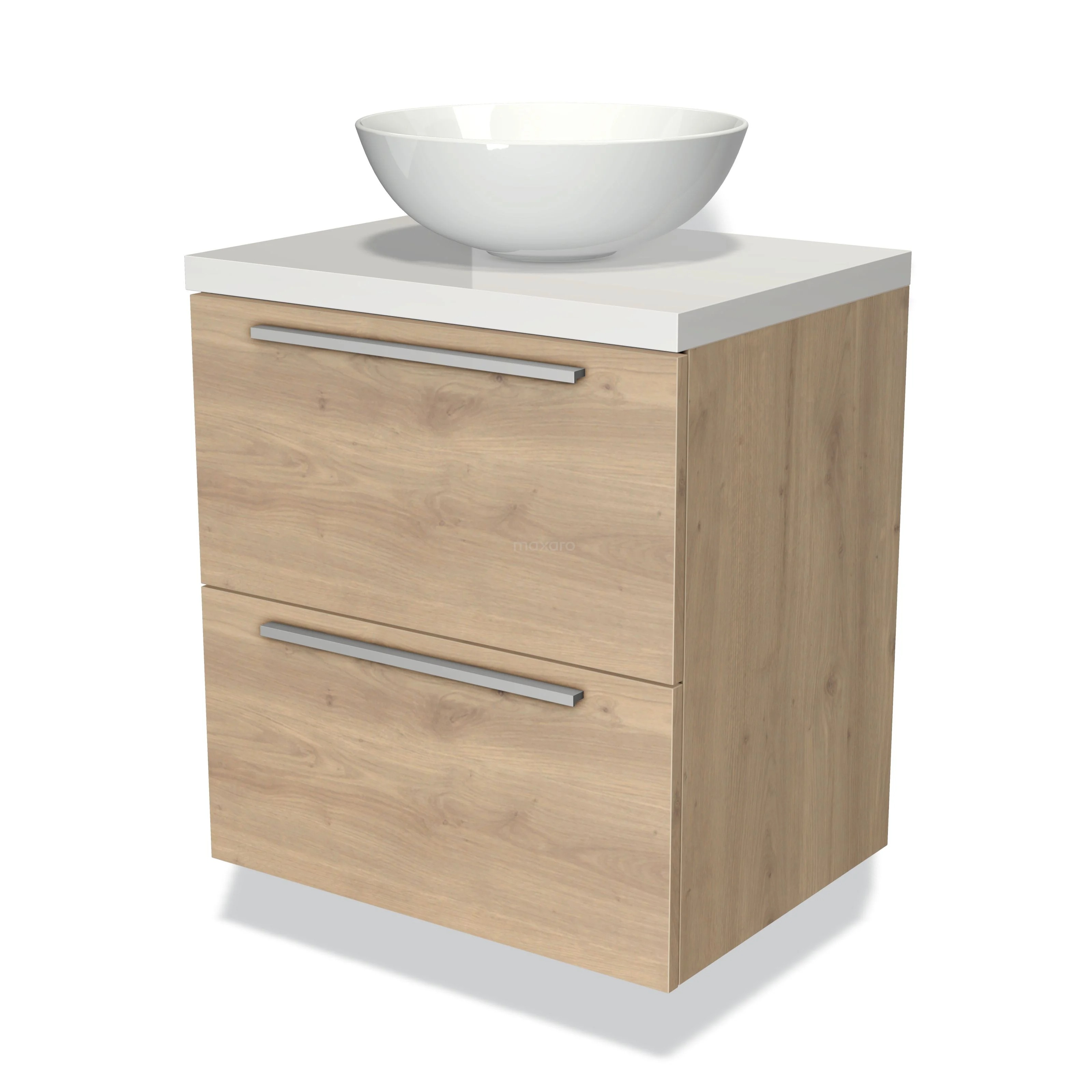 Modulo Plato Badmöbel mit Aufsatzwaschbecken | 60 cm Hellbraune Eiche Flach front Hochglanz Weiß blatt 2 übereinanderliegende Schubladen