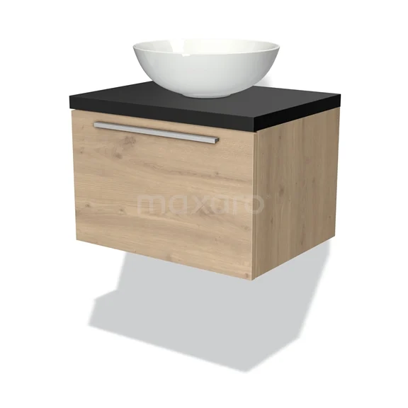 Modulo Plato Badmöbel mit Aufsatzwaschbecken | 60 cm Hellbraune Eiche Flach front Matt Schwarz blatt 1 Schublade