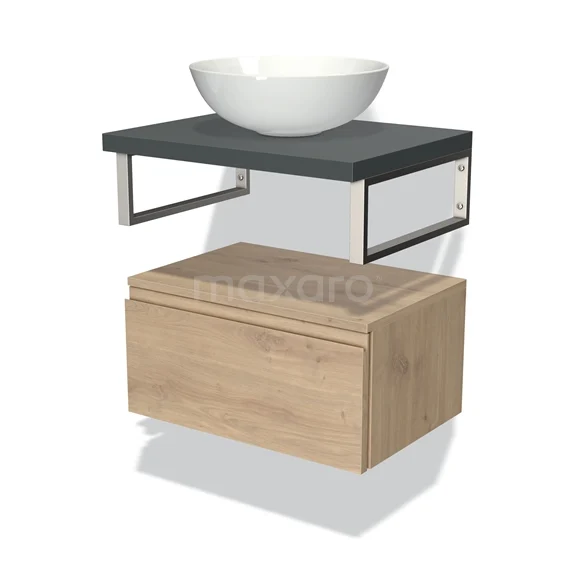 Modulo Plato Badmöbel mit Aufsatzwaschbecken | 60 cm Hellbraune Eiche Grifflos front Dunkelgrau blatt Tief hängend
