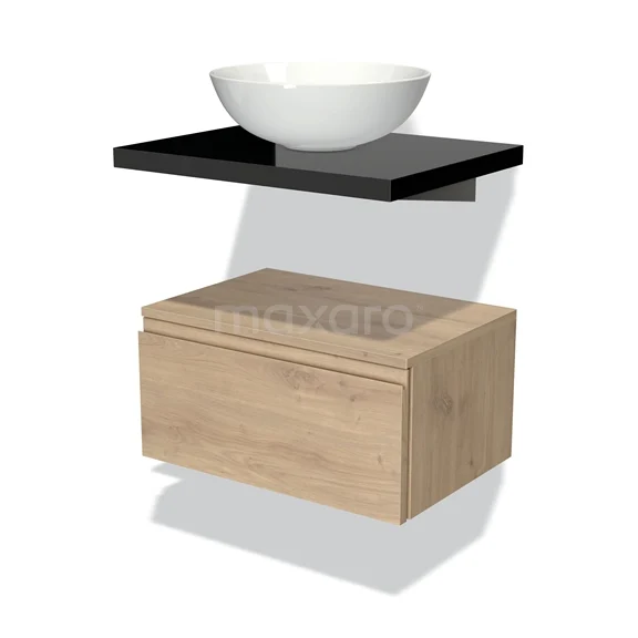 Modulo Plato Badmöbel mit Aufsatzwaschbecken | 60 cm Hellbraune Eiche Grifflos front Hochglanz Schwarz blatt Tief hängend