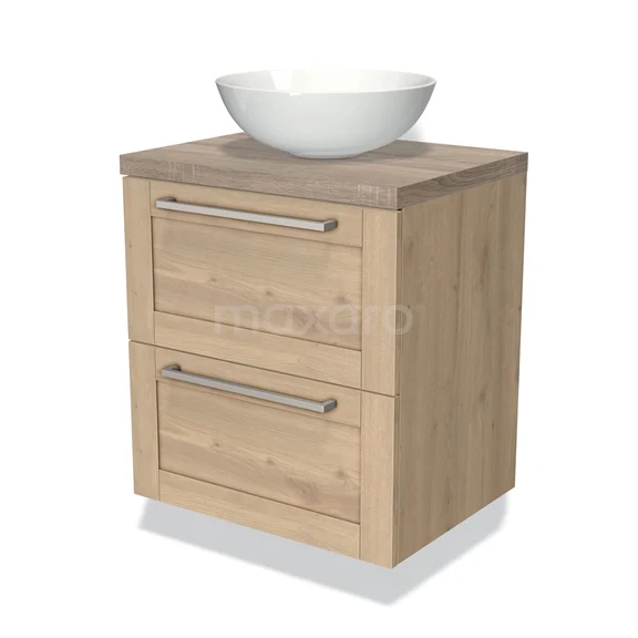 Modulo Plato Badmöbel mit Aufsatzwaschbecken | 60 cm Hellbraune Eiche Rahmen front Eiche blatt 2 übereinanderliegende Schubladen