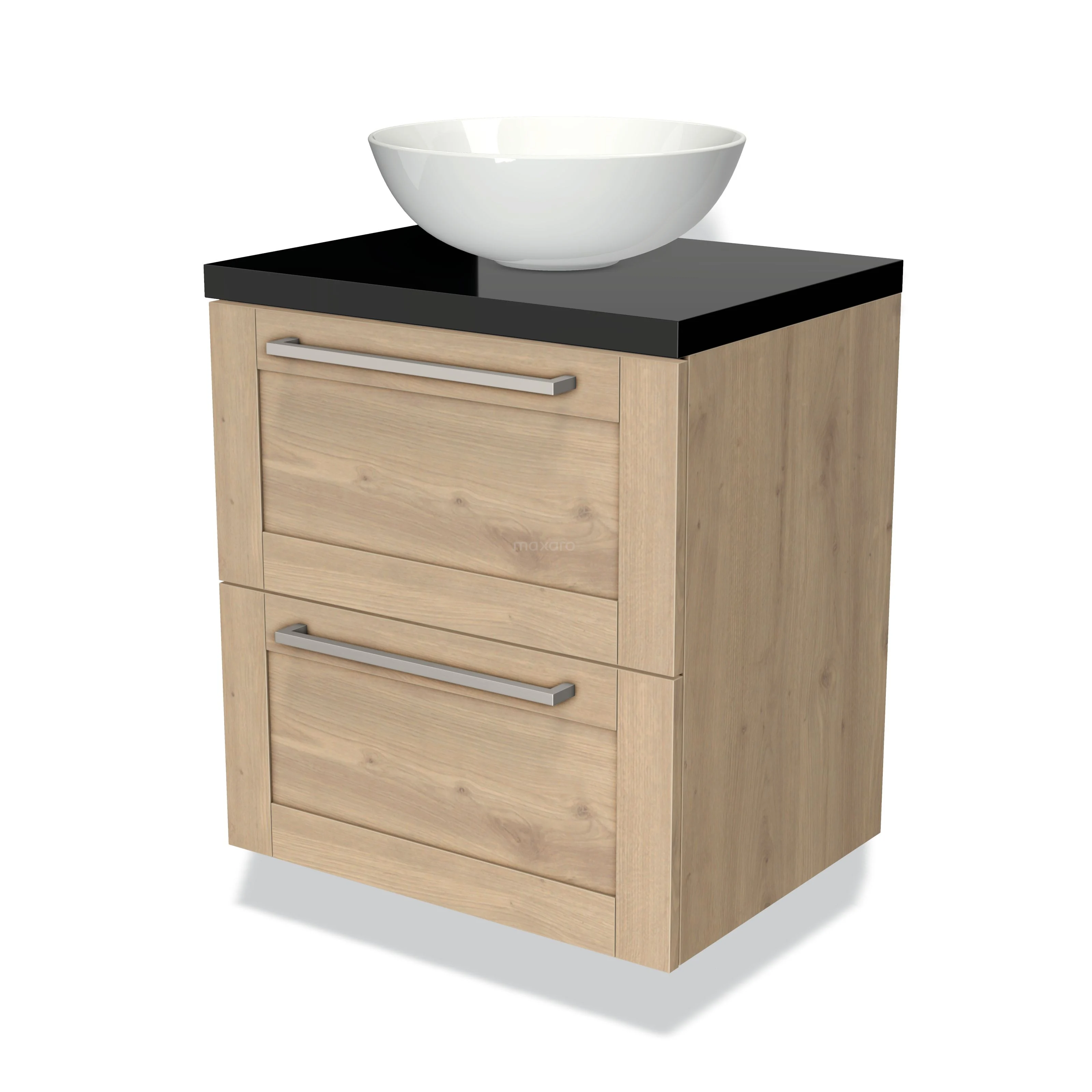 Modulo Plato Badmöbel mit Aufsatzwaschbecken | 60 cm Hellbraune Eiche Rahmen front Hochglanz Schwarz blatt 2 übereinanderliegende Schubladen