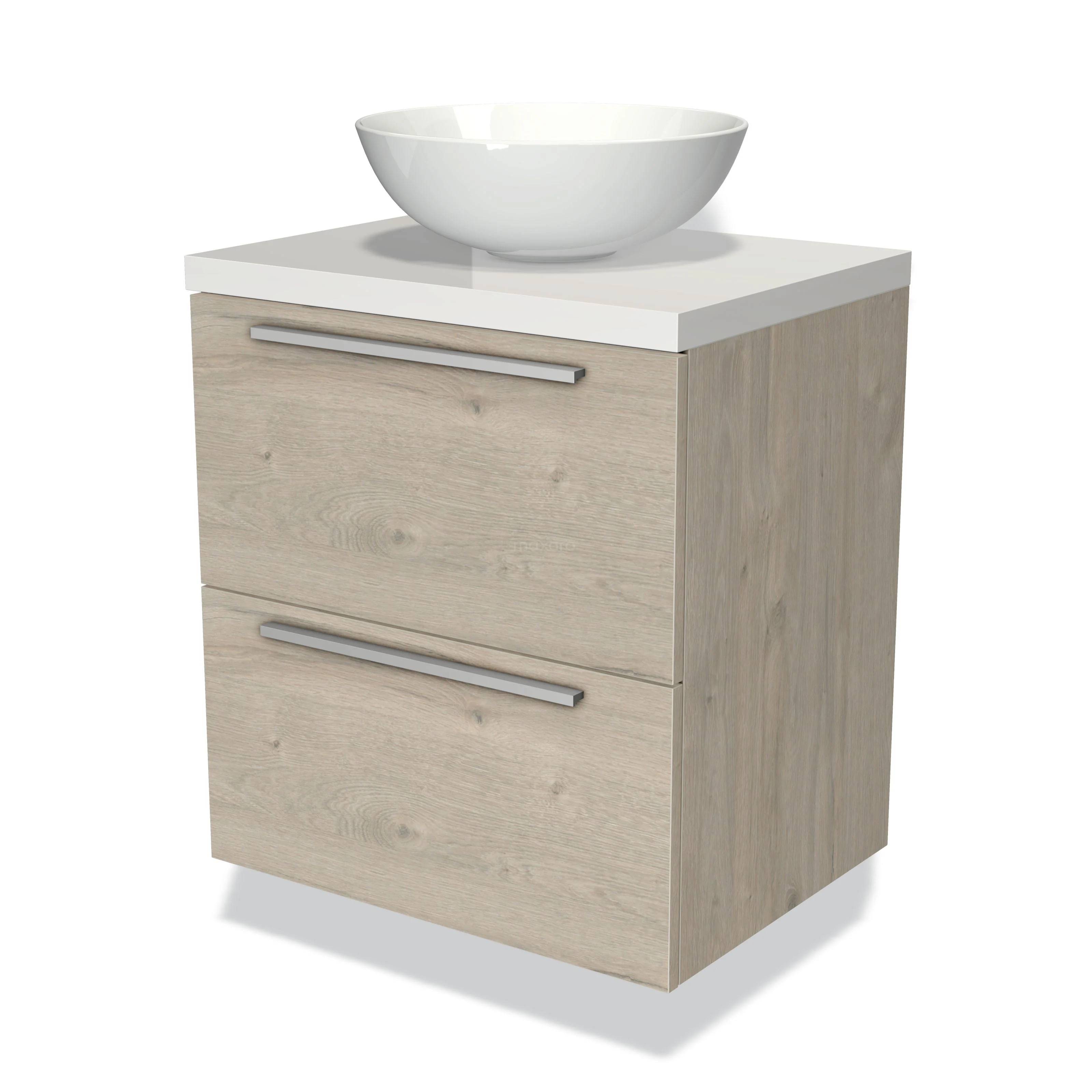 Modulo Plato Badmöbel mit Aufsatzwaschbecken | 60 cm Hellgraue Eiche Flach front Hochglanz Weiß blatt 2 übereinanderliegende Schubladen