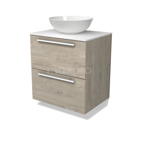 Modulo Plato Badmöbel mit Aufsatzwaschbecken | 60 cm Hellgraue Eiche Flach front Solid Surface blatt 2 übereinanderliegende Schubladen