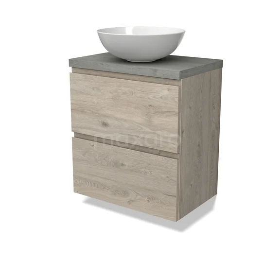 Modulo Plato Badmöbel mit Aufsatzwaschbecken | 60 cm Hellgraue Eiche Grifflos front Graue Eiche blatt 2 übereinanderliegende Schubladen