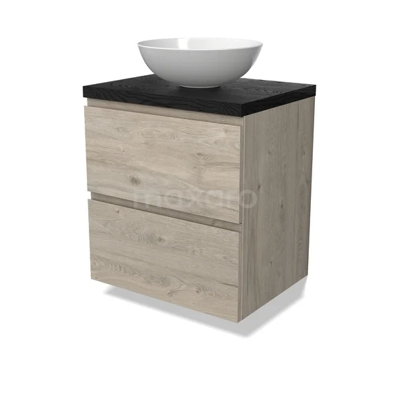 Modulo Plato Badmöbel mit Aufsatzwaschbecken | 60 cm Hellgraue Eiche Grifflos front Schwarze Eiche blatt 2 übereinanderliegende Schubladen