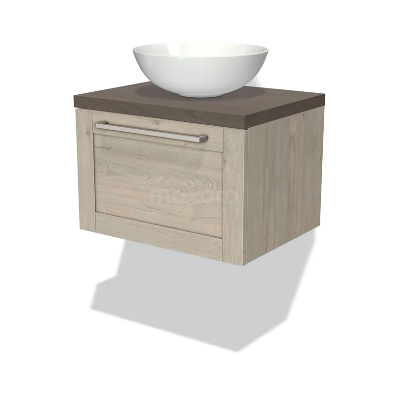 Modulo Plato Badmöbel mit Aufsatzwaschbecken | 60 cm Hellgraue Eiche Rahmen front Dunkelbraune Eiche blatt 1 Schublade