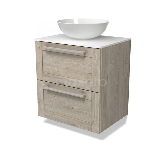 Modulo Plato Badmöbel mit Aufsatzwaschbecken | 60 cm Hellgraue Eiche Rahmen front Solid Surface blatt 2 übereinanderliegende Schubladen