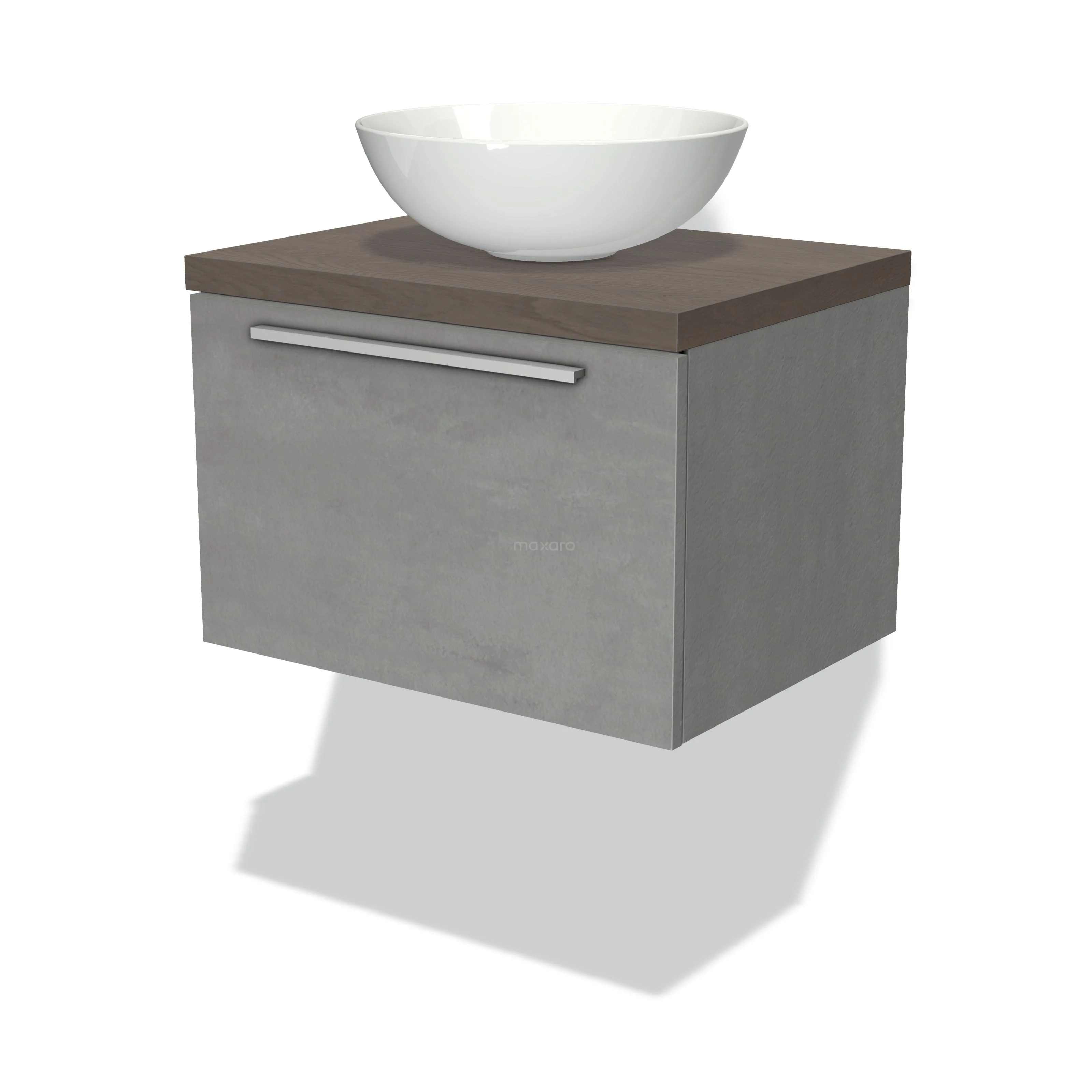 Modulo Plato Badmöbel mit Aufsatzwaschbecken | 60 cm Hellgrauer Beton Flach front Dunkelbraune Eiche blatt 1 Schublade
