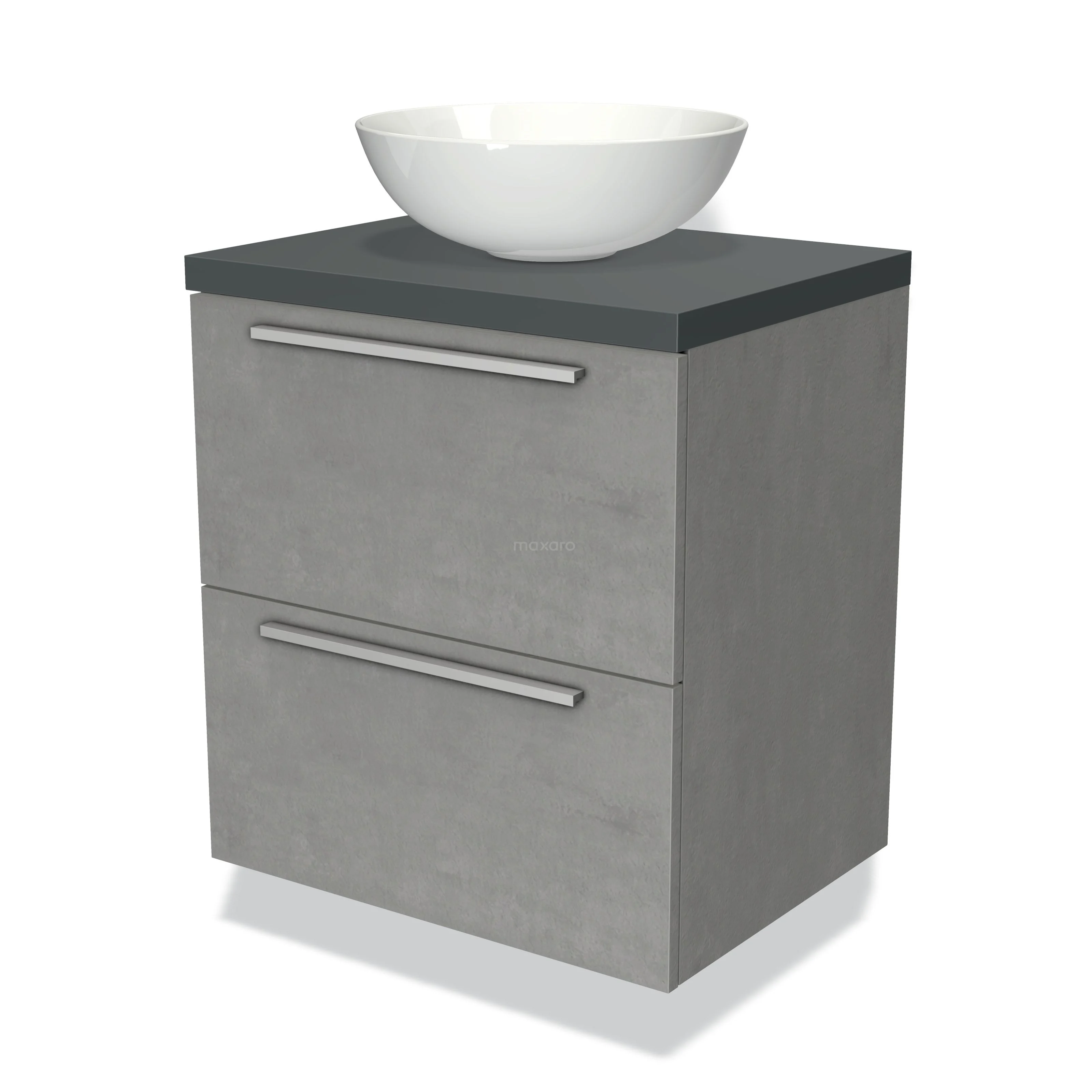 Modulo Plato Badmöbel mit Aufsatzwaschbecken | 60 cm Hellgrauer Beton Flach front Dunkelgrau blatt 2 übereinanderliegende Schubladen