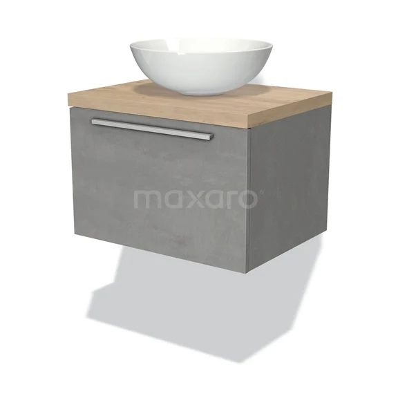 Modulo Plato Badmöbel mit Aufsatzwaschbecken | 60 cm Hellgrauer Beton Flach front Hellbraune Eiche blatt 1 Schublade