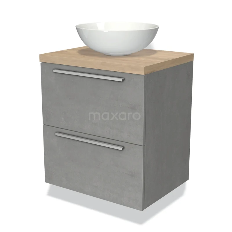 Modulo Plato Badmöbel mit Aufsatzwaschbecken | 60 cm Hellgrauer Beton Flach front Hellbraune Eiche blatt 2 übereinanderliegende Schubladen