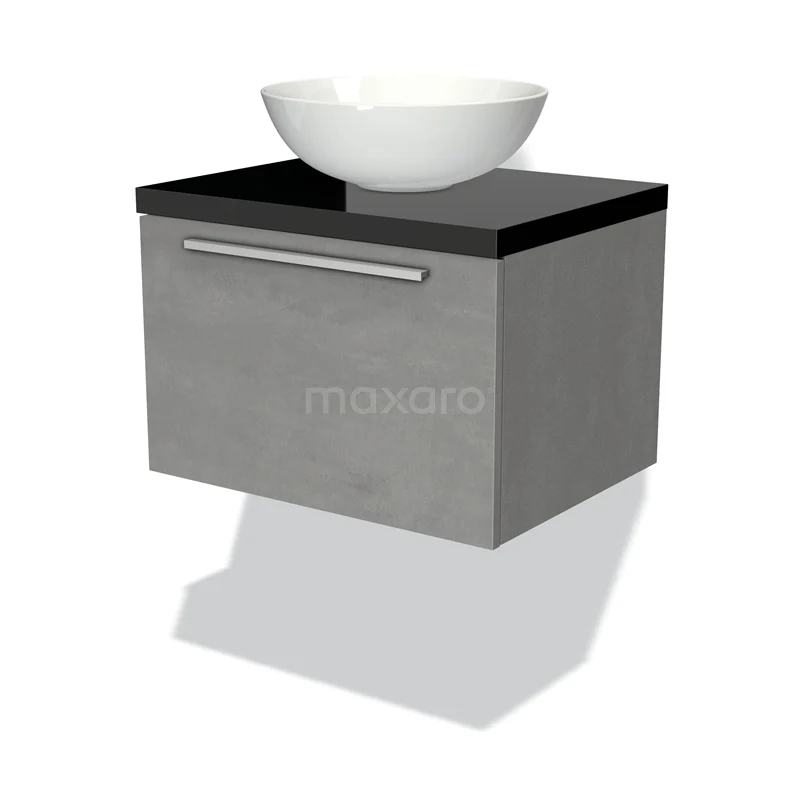 Modulo Plato Badmöbel mit Aufsatzwaschbecken | 60 cm Hellgrauer Beton Flach front Hochglanz Schwarz blatt 1 Schublade