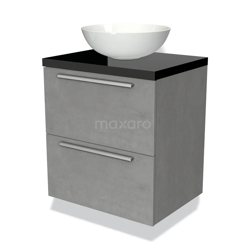 Modulo Plato Badmöbel mit Aufsatzwaschbecken | 60 cm Hellgrauer Beton Flach front Hochglanz Schwarz blatt 2 übereinanderliegende Schubladen