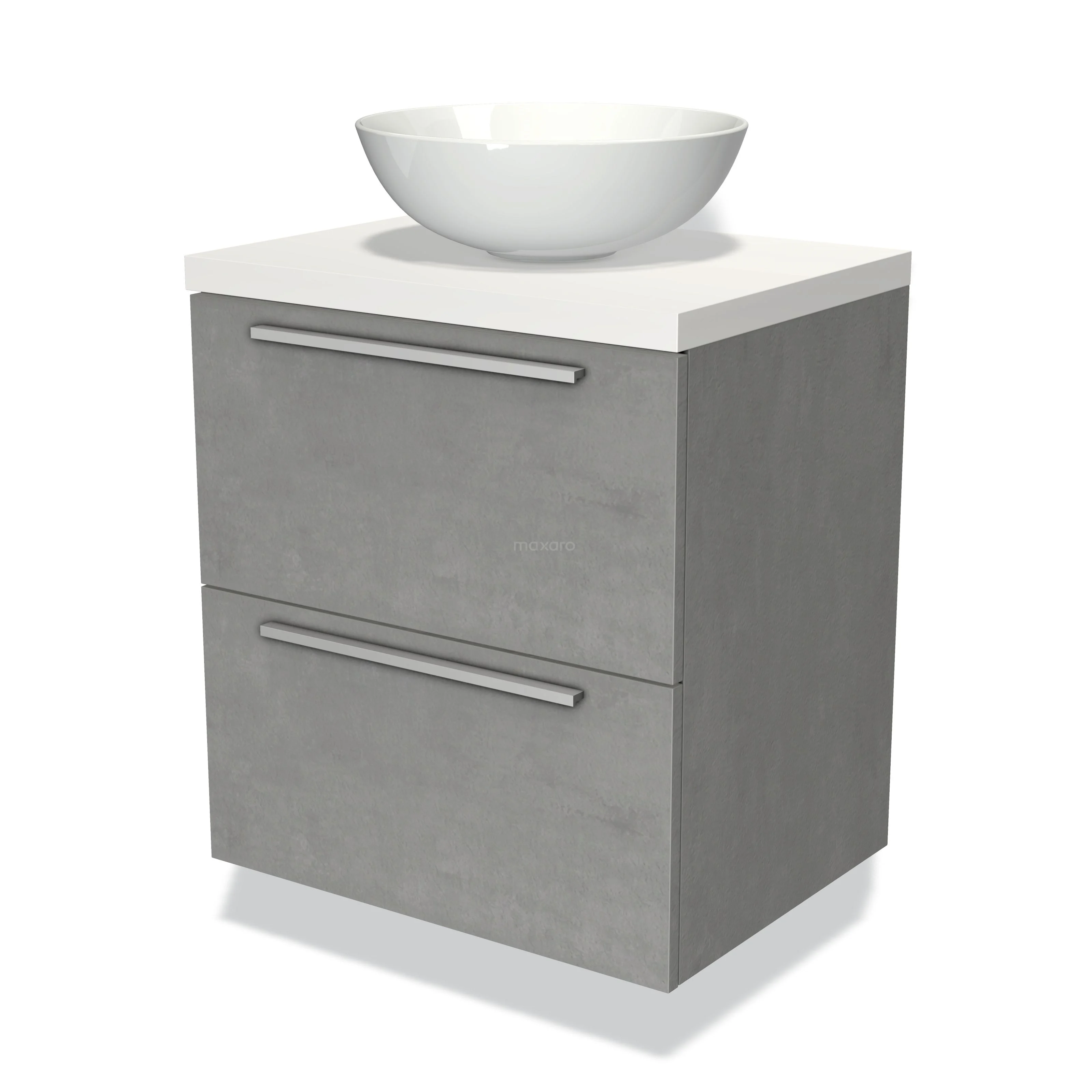 Modulo Plato Badmöbel mit Aufsatzwaschbecken | 60 cm Hellgrauer Beton Flach front Matt Weiß blatt 2 übereinanderliegende Schubladen
