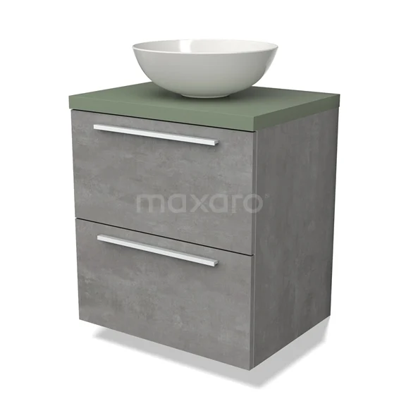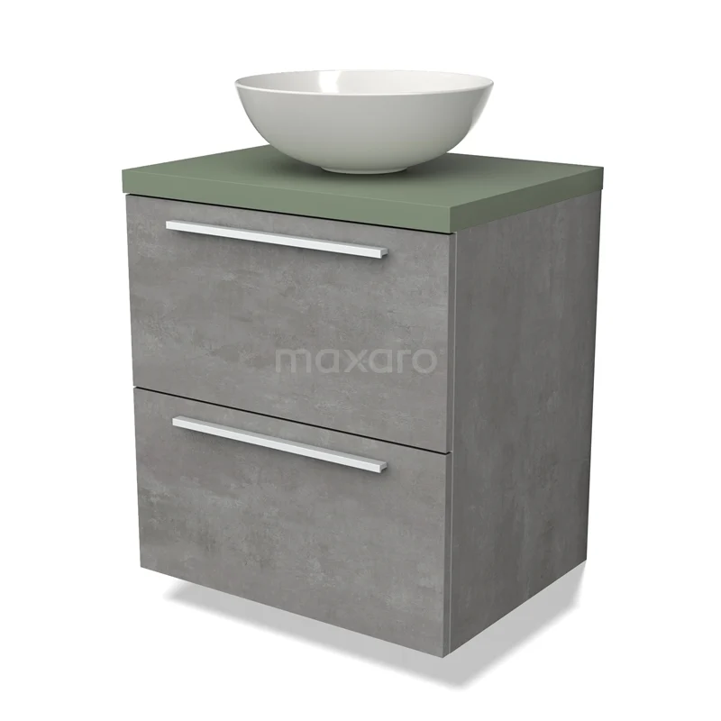 Modulo Plato Badmöbel mit Aufsatzwaschbecken | 60 cm Hellgrauer Beton Flach front Salbeigrün blatt 2 übereinanderliegende Schubladen