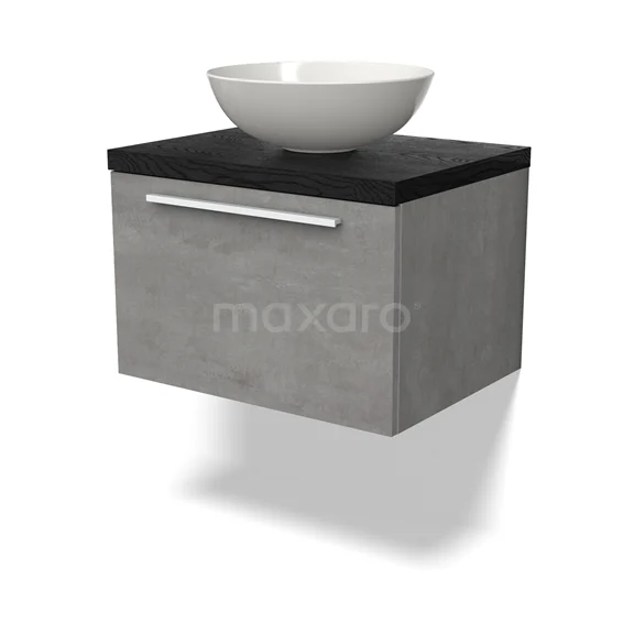 Modulo Plato Badmöbel mit Aufsatzwaschbecken | 60 cm Hellgrauer Beton Flach front Schwarze Eiche blatt 1 Schublade
