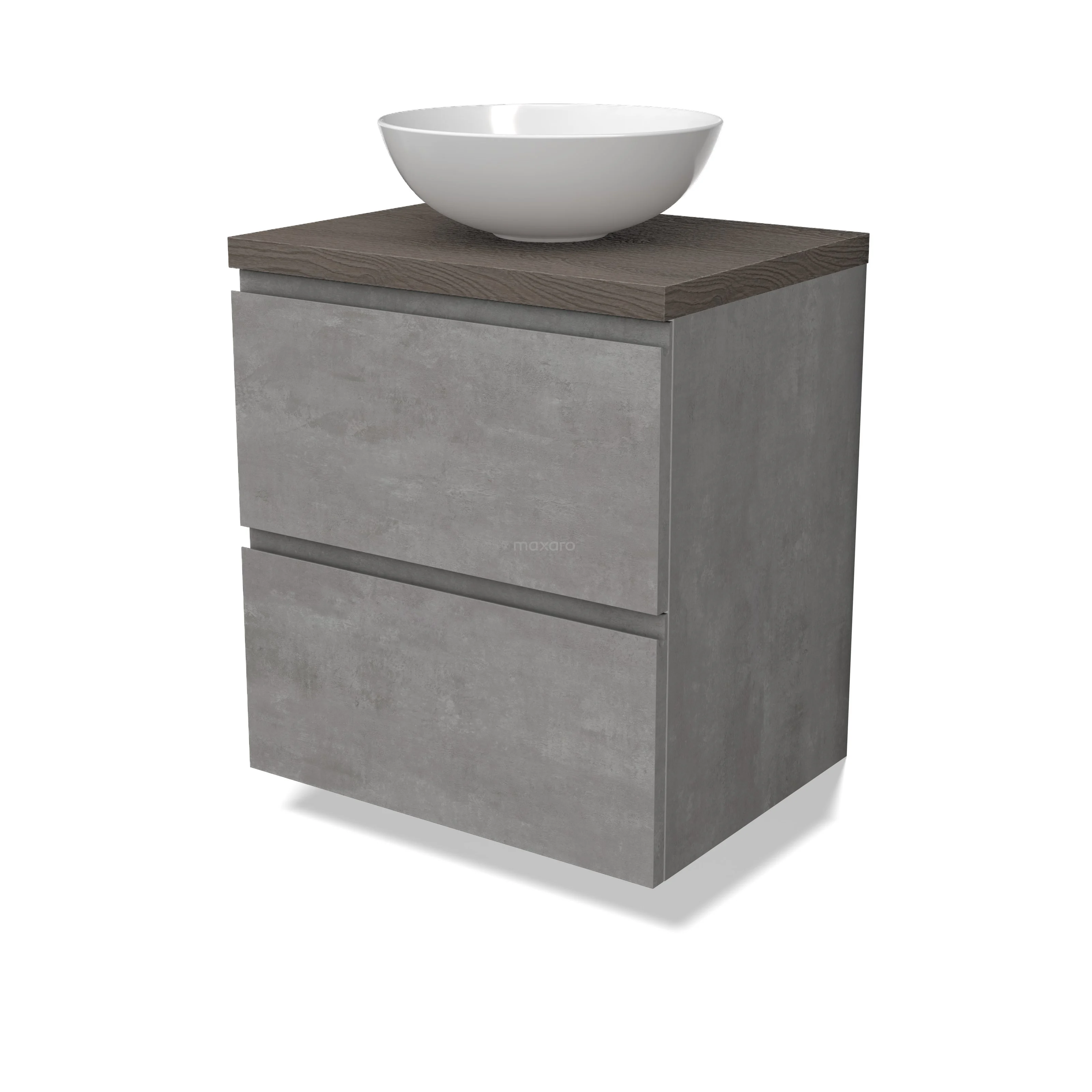 Modulo Plato Badmöbel mit Aufsatzwaschbecken | 60 cm Hellgrauer Beton Grifflos front Dunkelbraune Eiche blatt 2 übereinanderliegende Schubladen