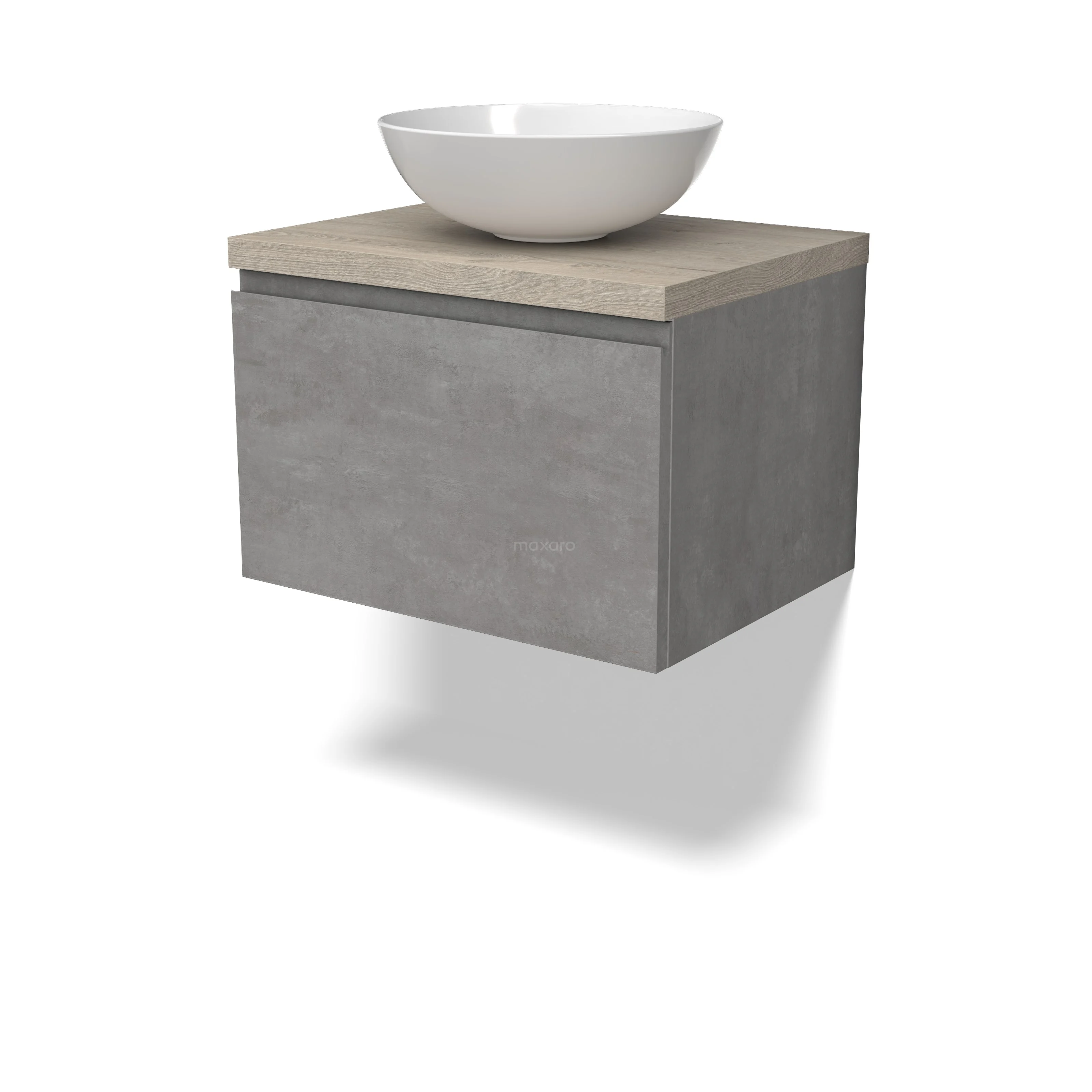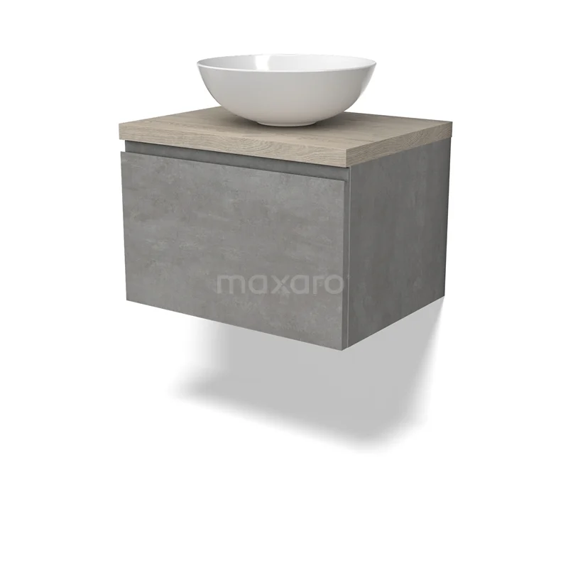 Modulo Plato Badmöbel mit Aufsatzwaschbecken | 60 cm Hellgrauer Beton Grifflos front Hellgraue Eiche blatt 1 Schublade