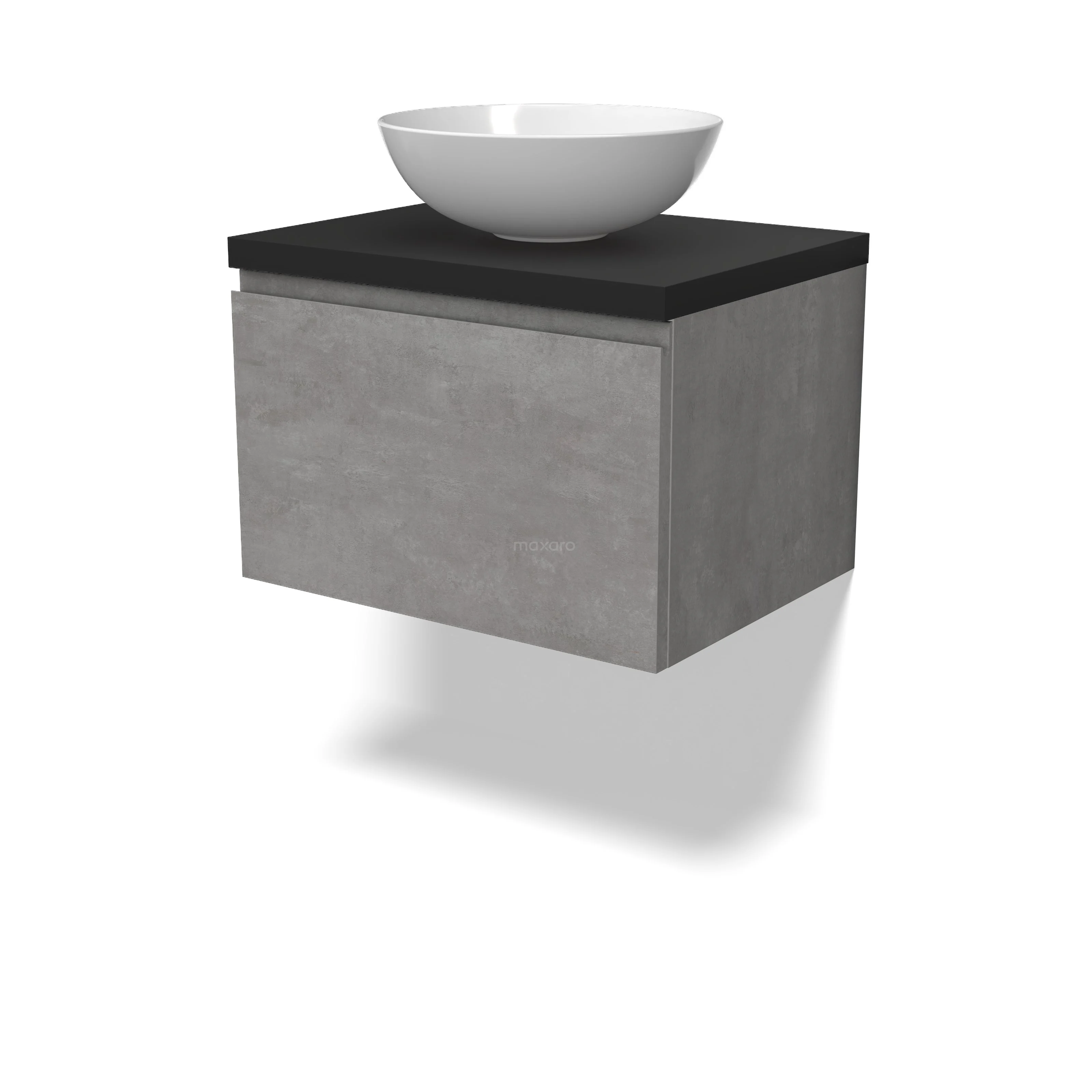 Modulo Plato Badmöbel mit Aufsatzwaschbecken | 60 cm Hellgrauer Beton Grifflos front Matt Schwarz blatt 1 Schublade