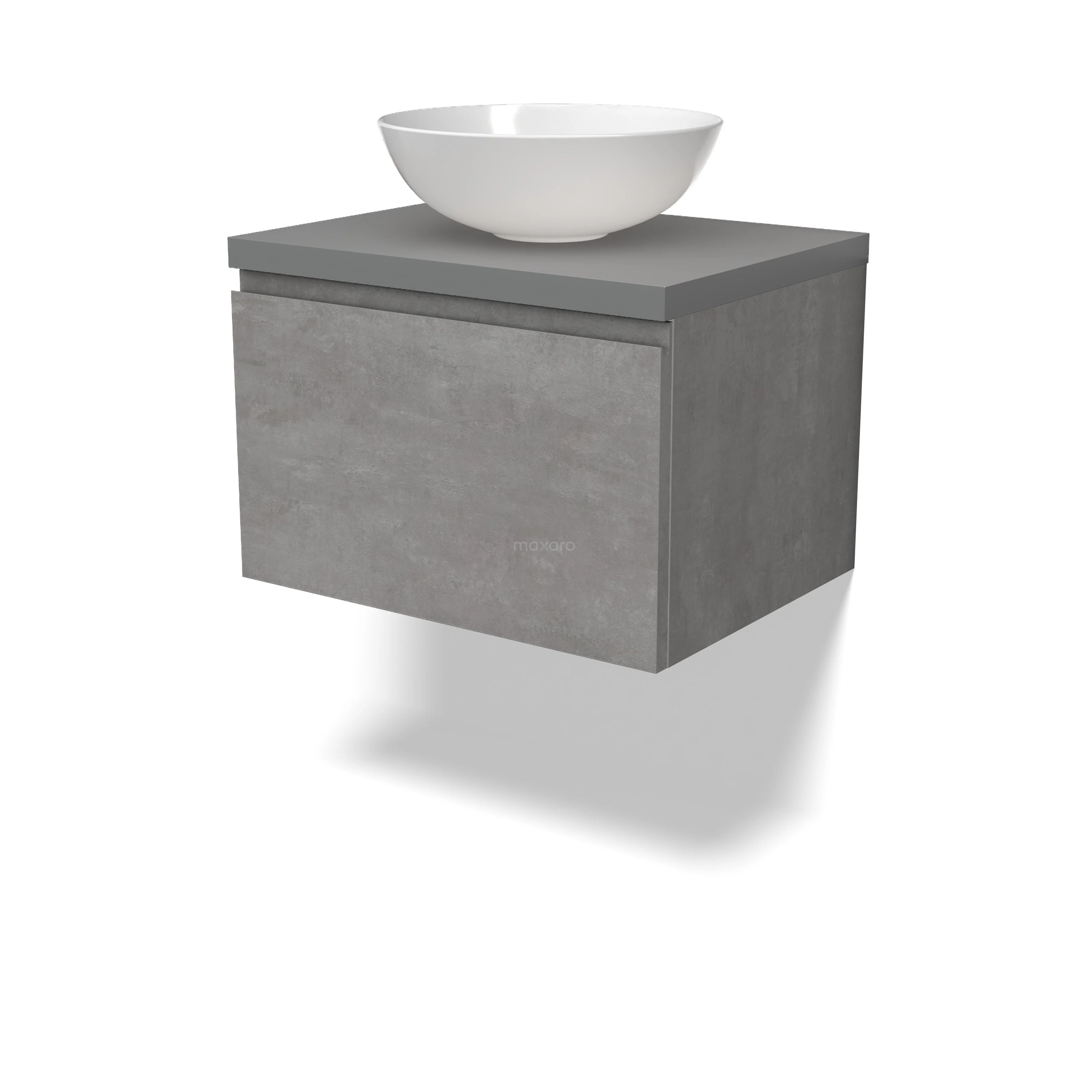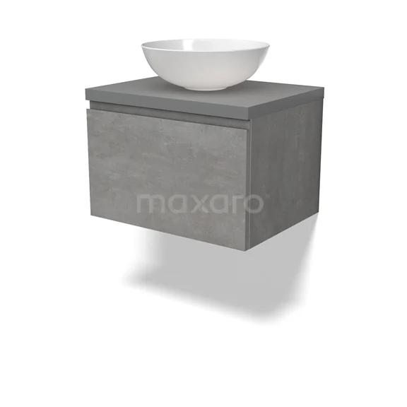 Modulo Plato Badmöbel mit Aufsatzwaschbecken | 60 cm Hellgrauer Beton Grifflos front Mittelgrau blatt 1 Schublade