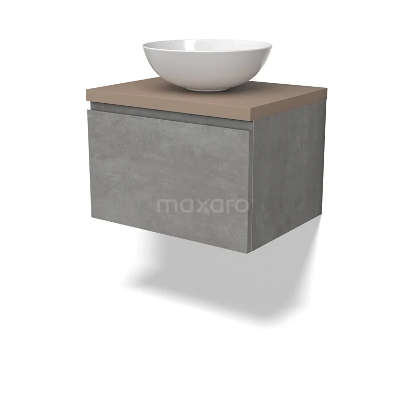 Modulo Plato Badmöbel mit Aufsatzwaschbecken | 60 cm Hellgrauer Beton Grifflos front Taupe blatt 1 Schublade