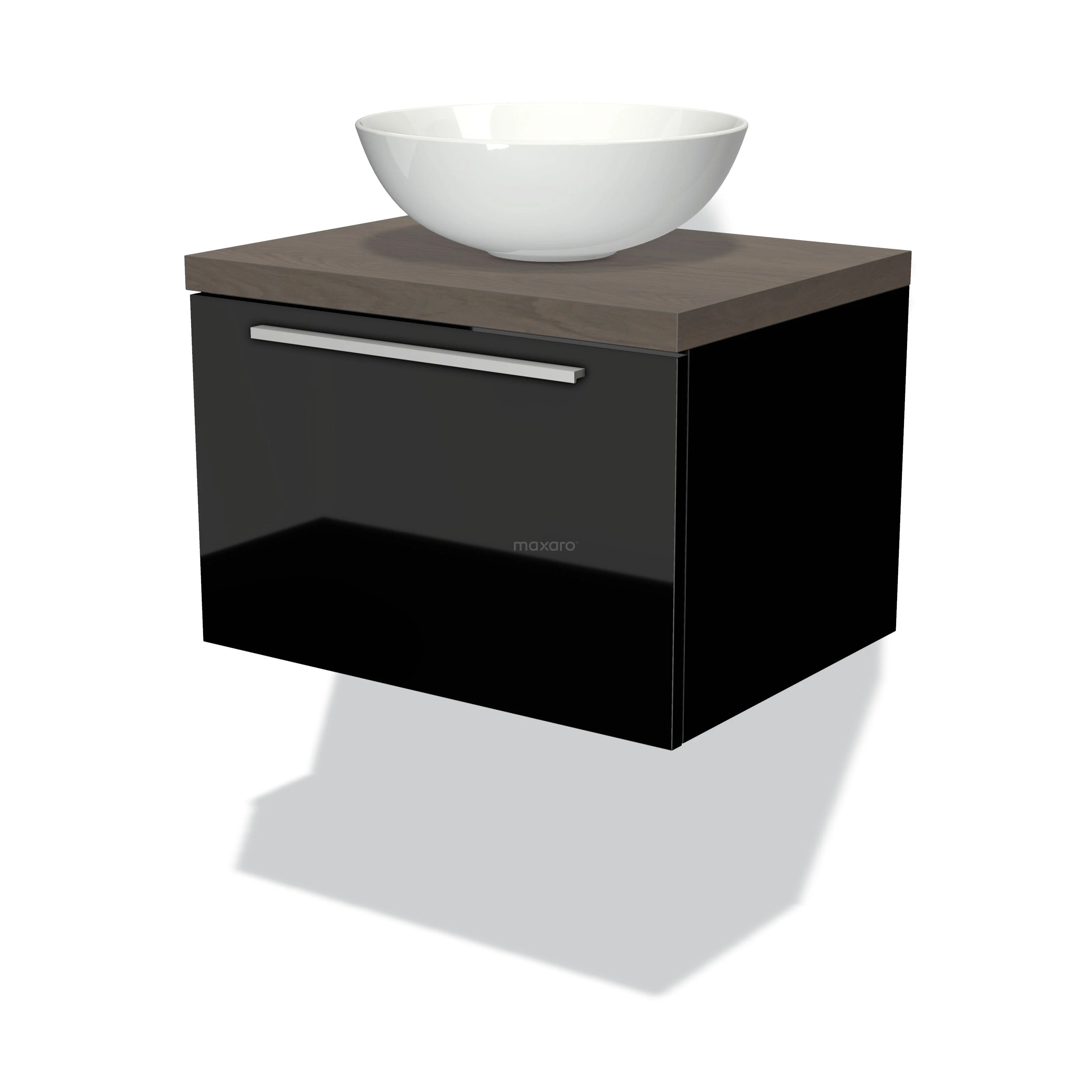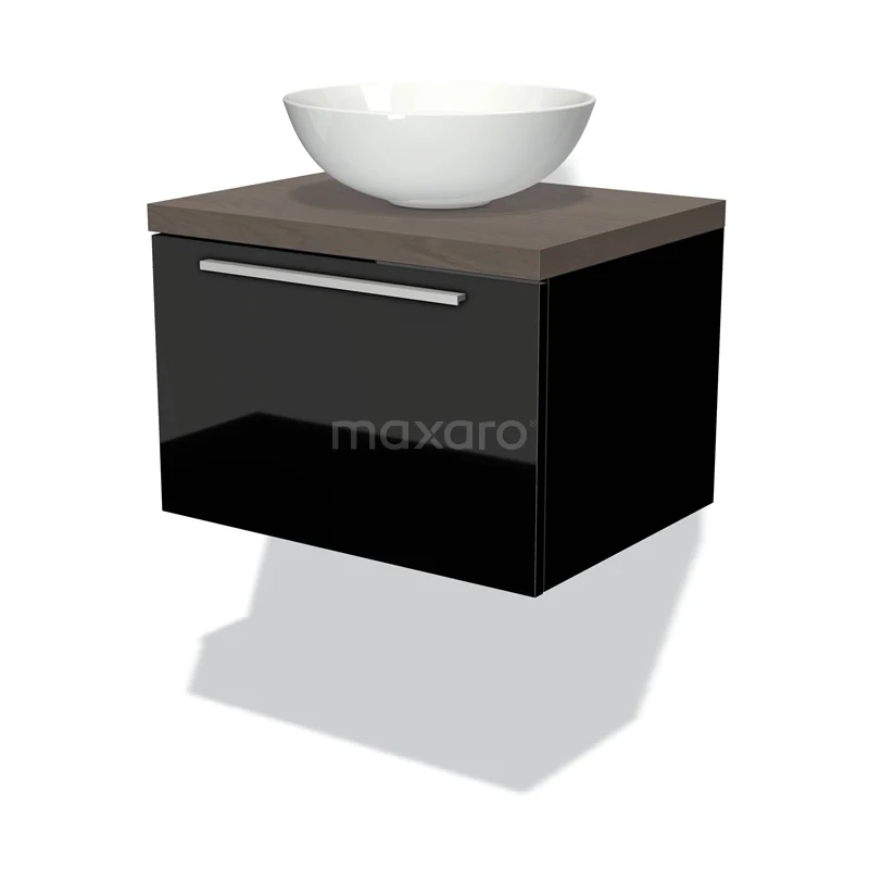 Modulo Plato Badmöbel mit Aufsatzwaschbecken | 60 cm Hochglanz Schwarz Flach front Dunkelbraune Eiche blatt 1 Schublade