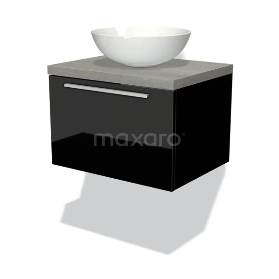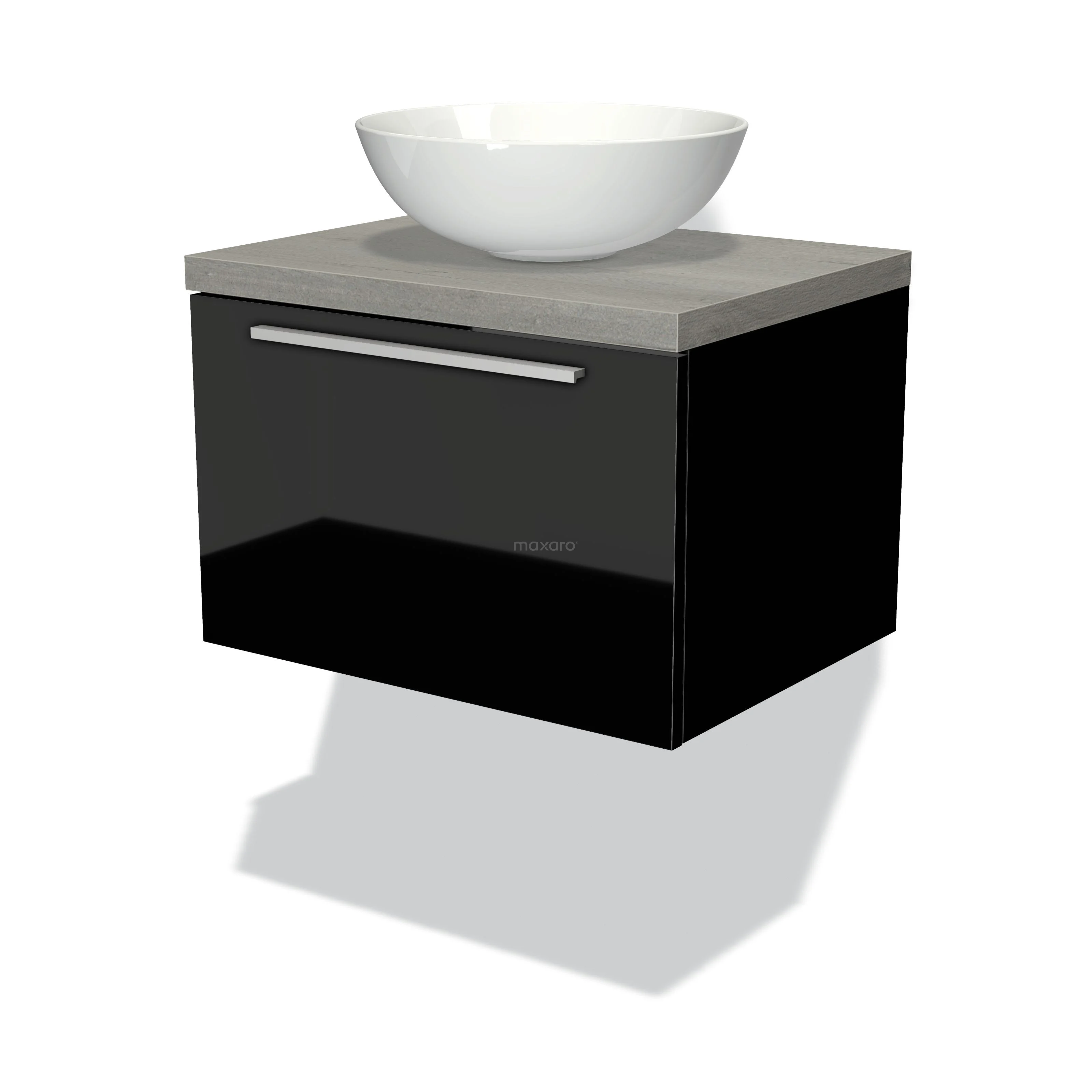 Modulo Plato Badmöbel mit Aufsatzwaschbecken | 60 cm Hochglanz Schwarz Flach front Graue Eiche blatt 1 Schublade
