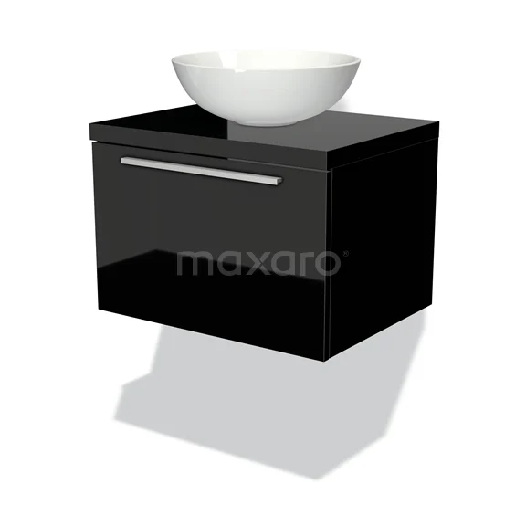 Modulo Plato Badmöbel mit Aufsatzwaschbecken | 60 cm Hochglanz Schwarz Flach front Hochglanz Schwarz blatt 1 Schublade