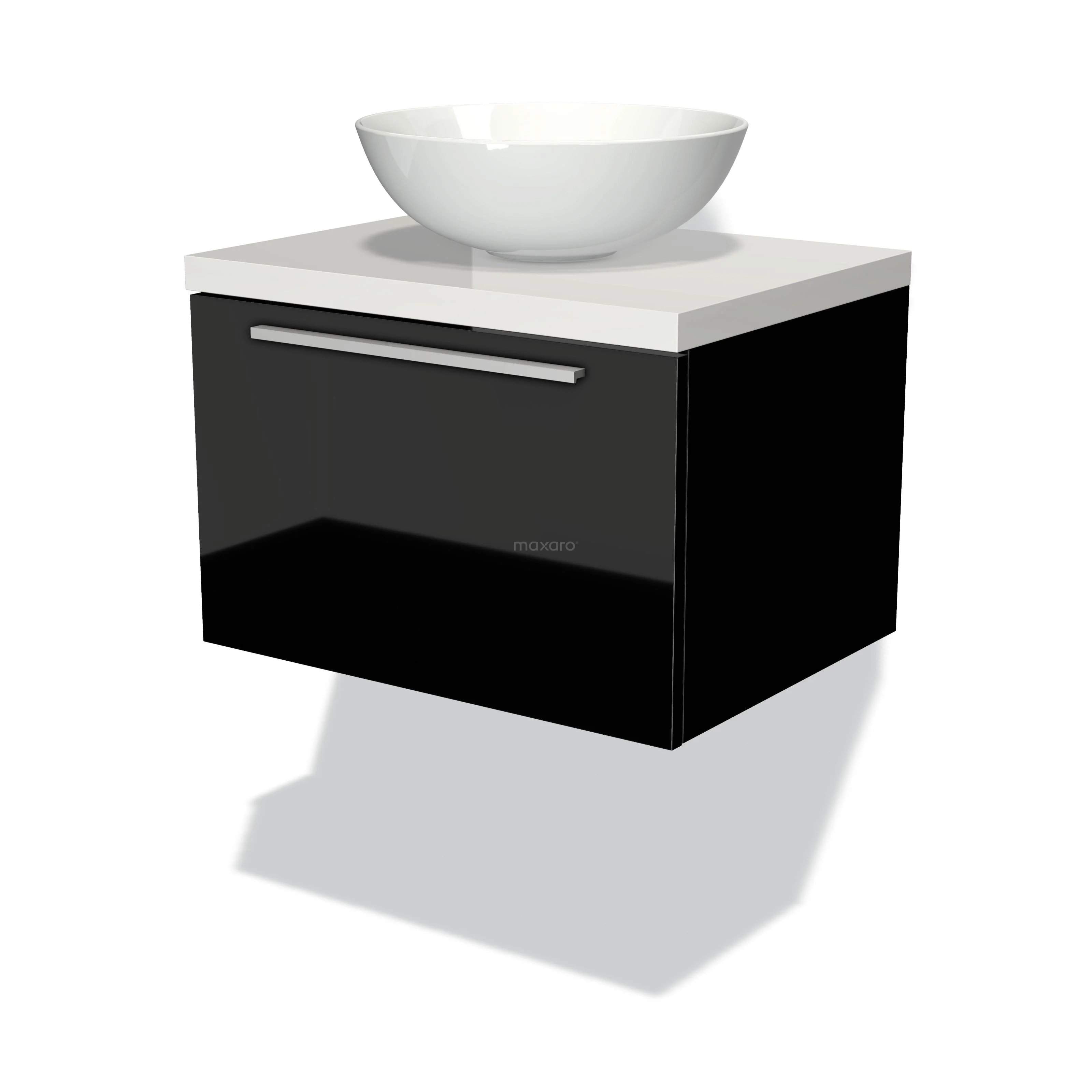 Modulo Plato Badmöbel mit Aufsatzwaschbecken | 60 cm Hochglanz Schwarz Flach front Hochglanz Weiß blatt 1 Schublade