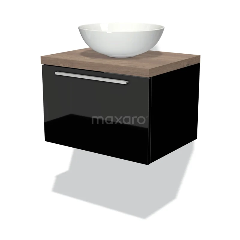 Modulo Plato Badmöbel mit Aufsatzwaschbecken | 60 cm Hochglanz Schwarz Flach front Mittelbraune Eiche blatt 1 Schublade