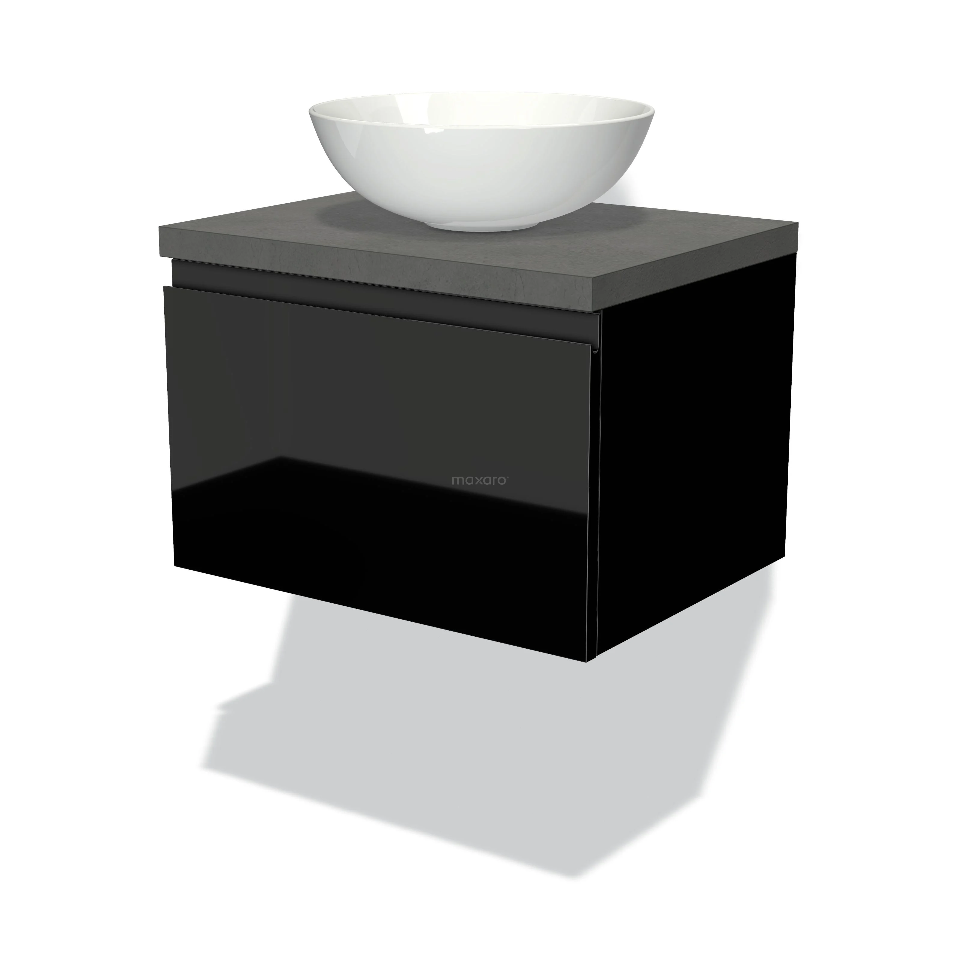 Modulo Plato Badmöbel mit Aufsatzwaschbecken | 60 cm Hochglanz Schwarz Grifflos front Dunkelgrauer Beton blatt 1 Schublade