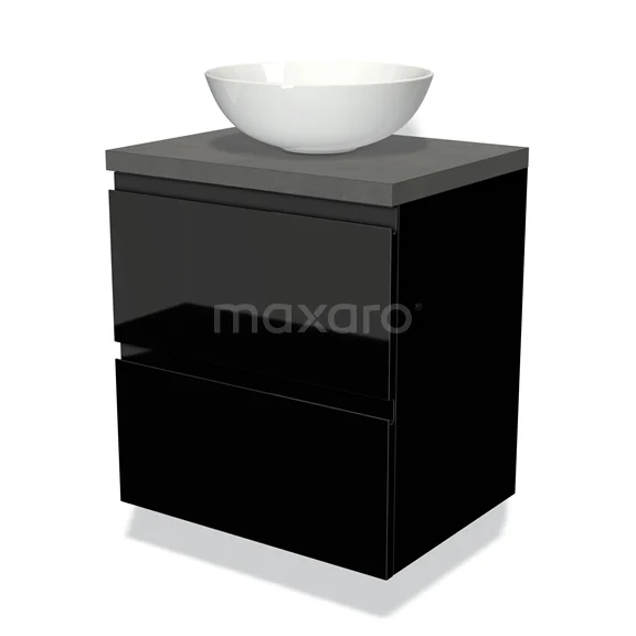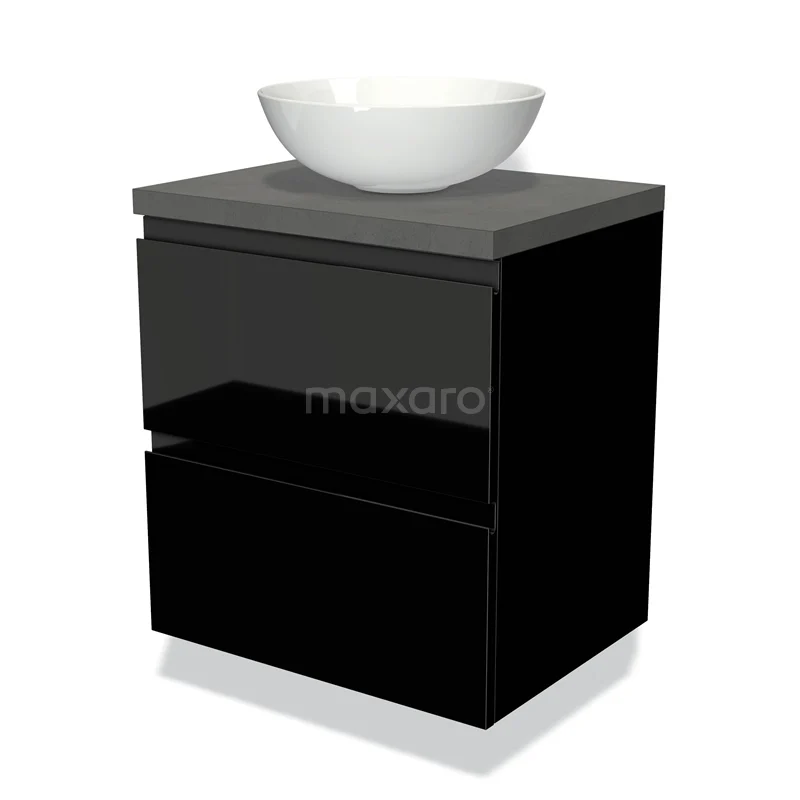 Modulo Plato Badmöbel mit Aufsatzwaschbecken | 60 cm Hochglanz Schwarz Grifflos front Dunkelgrauer Beton blatt 2 übereinanderliegende Schubladen