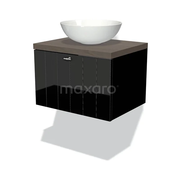 Modulo Plato Badmöbel mit Aufsatzwaschbecken | 60 cm Hochglanz Schwarz Lamelle front Dunkelbraune Eiche blatt 1 Schublade