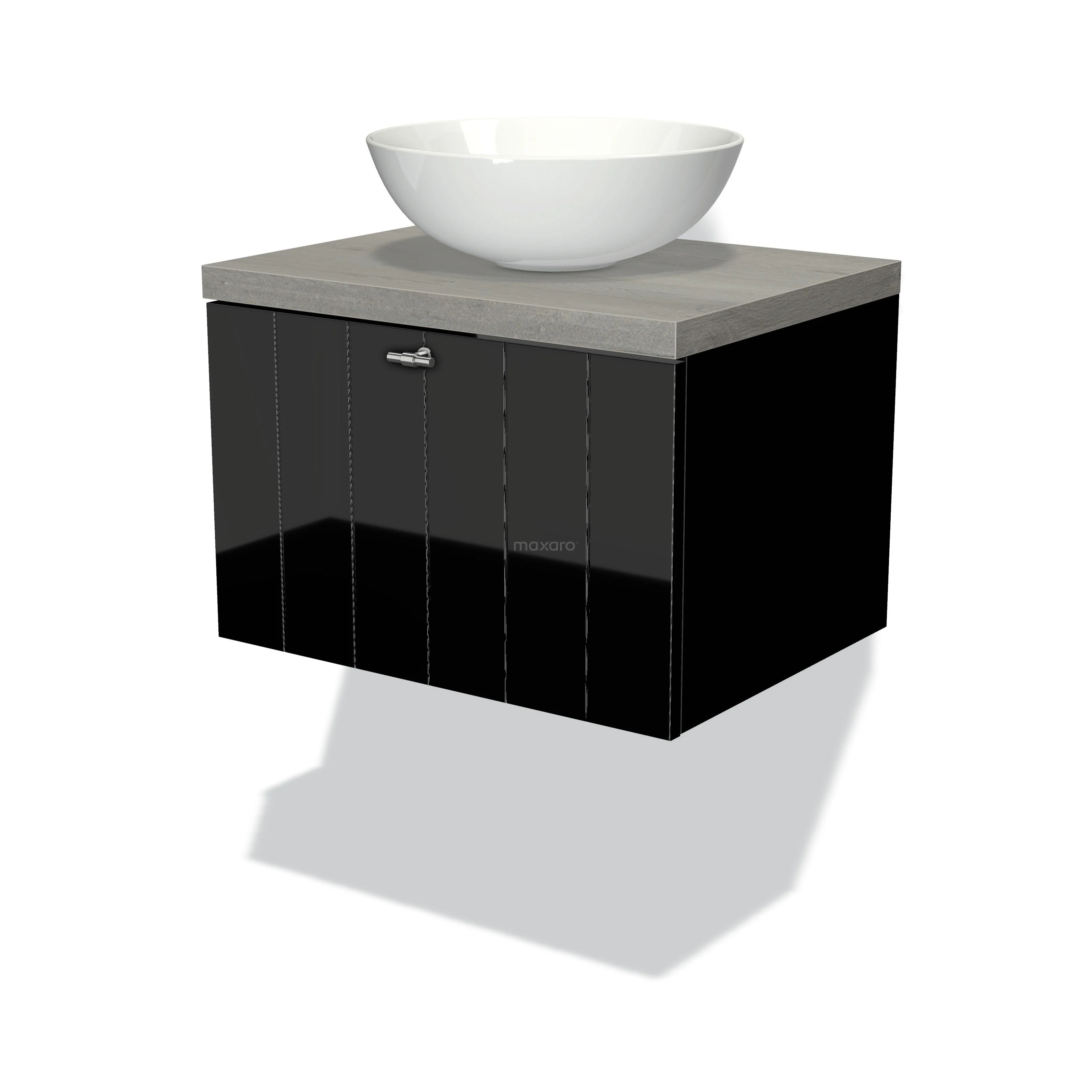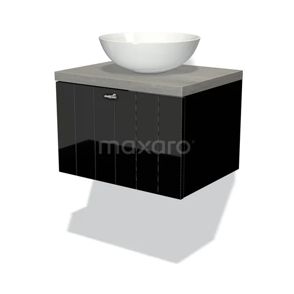 Modulo Plato Badmöbel mit Aufsatzwaschbecken | 60 cm Hochglanz Schwarz Lamelle front Graue Eiche blatt 1 Schublade