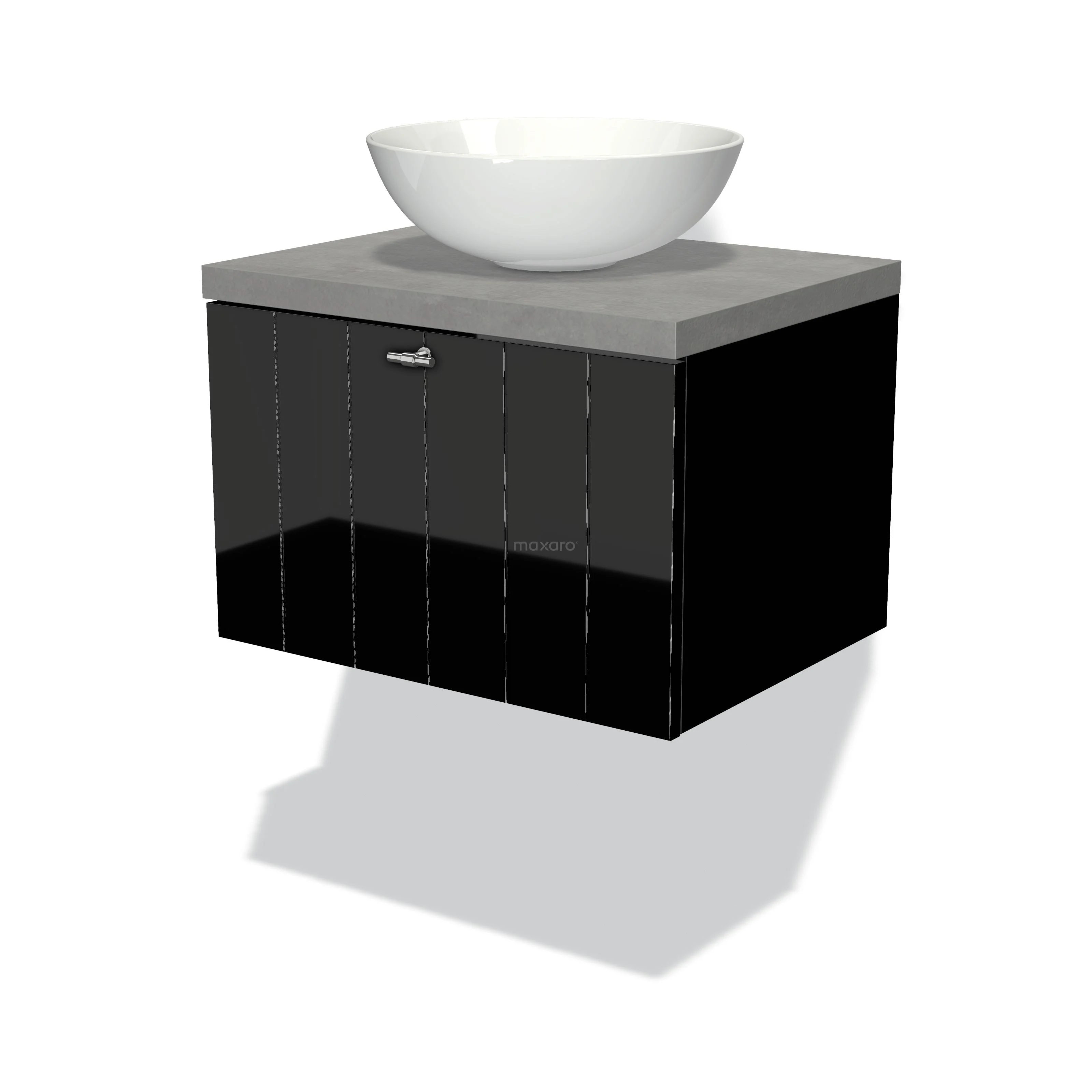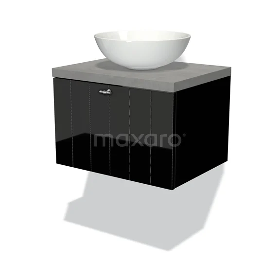 Modulo Plato Badmöbel mit Aufsatzwaschbecken | 60 cm Hochglanz Schwarz Lamelle front Hellgrauer Beton blatt 1 Schublade