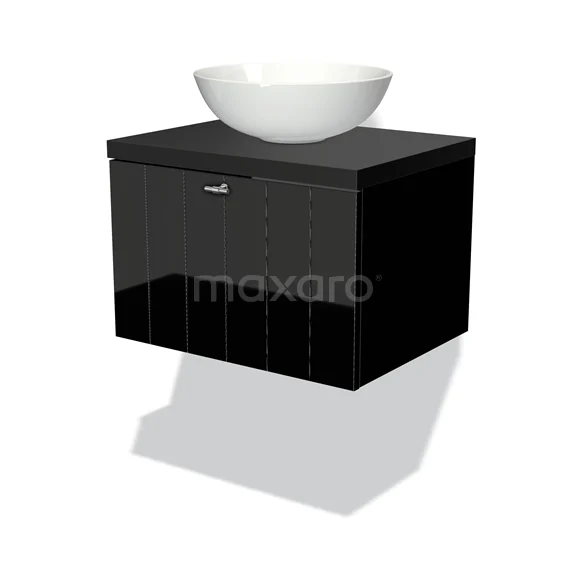Modulo Plato Badmöbel mit Aufsatzwaschbecken | 60 cm Hochglanz Schwarz Lamelle front Matt Schwarz blatt 1 Schublade