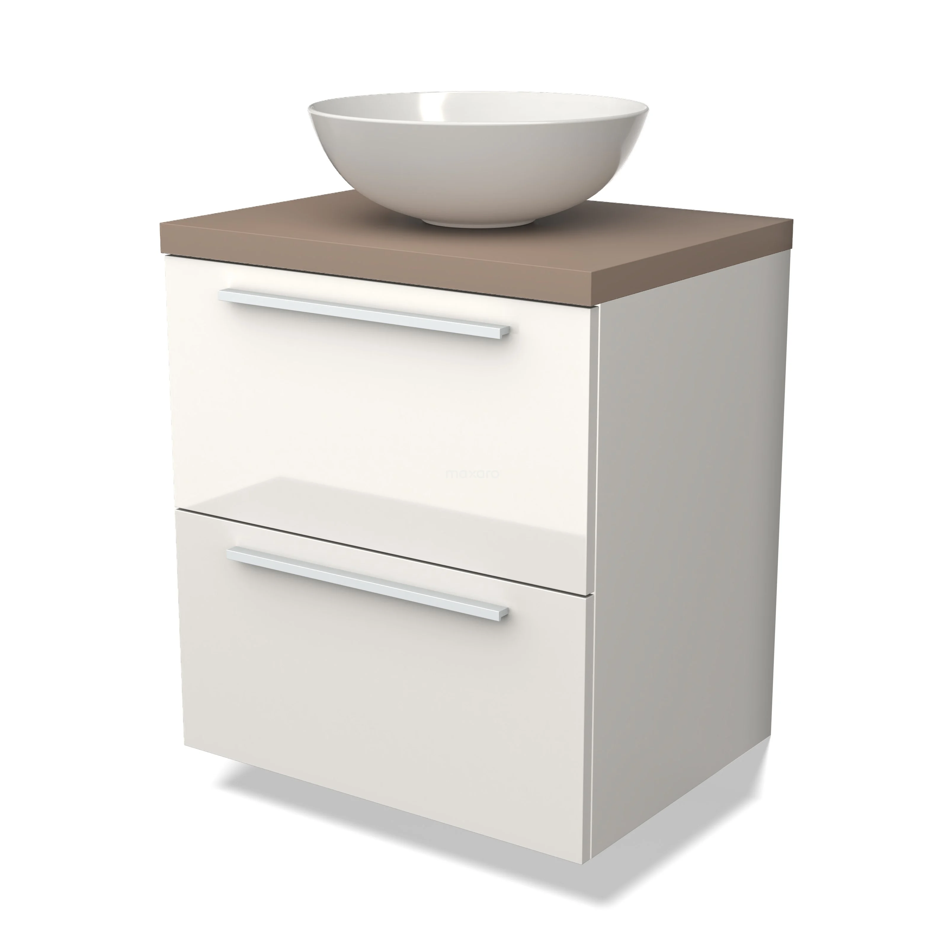 Modulo Plato Badmöbel mit Aufsatzwaschbecken | 60 cm Hochglanz Weiß Flach front Taupe blatt 2 übereinanderliegende Schubladen