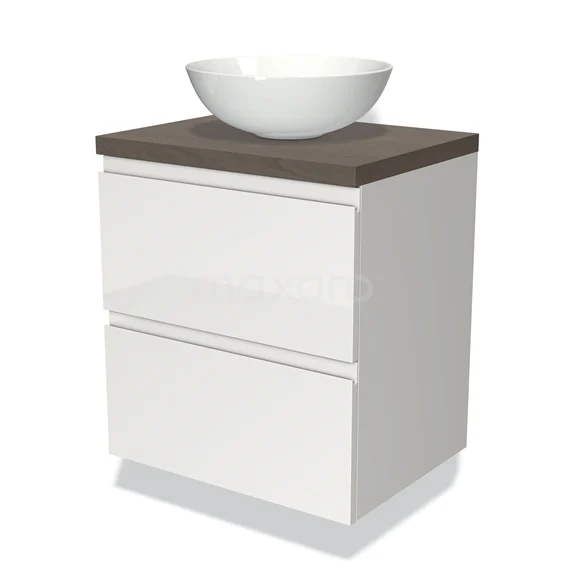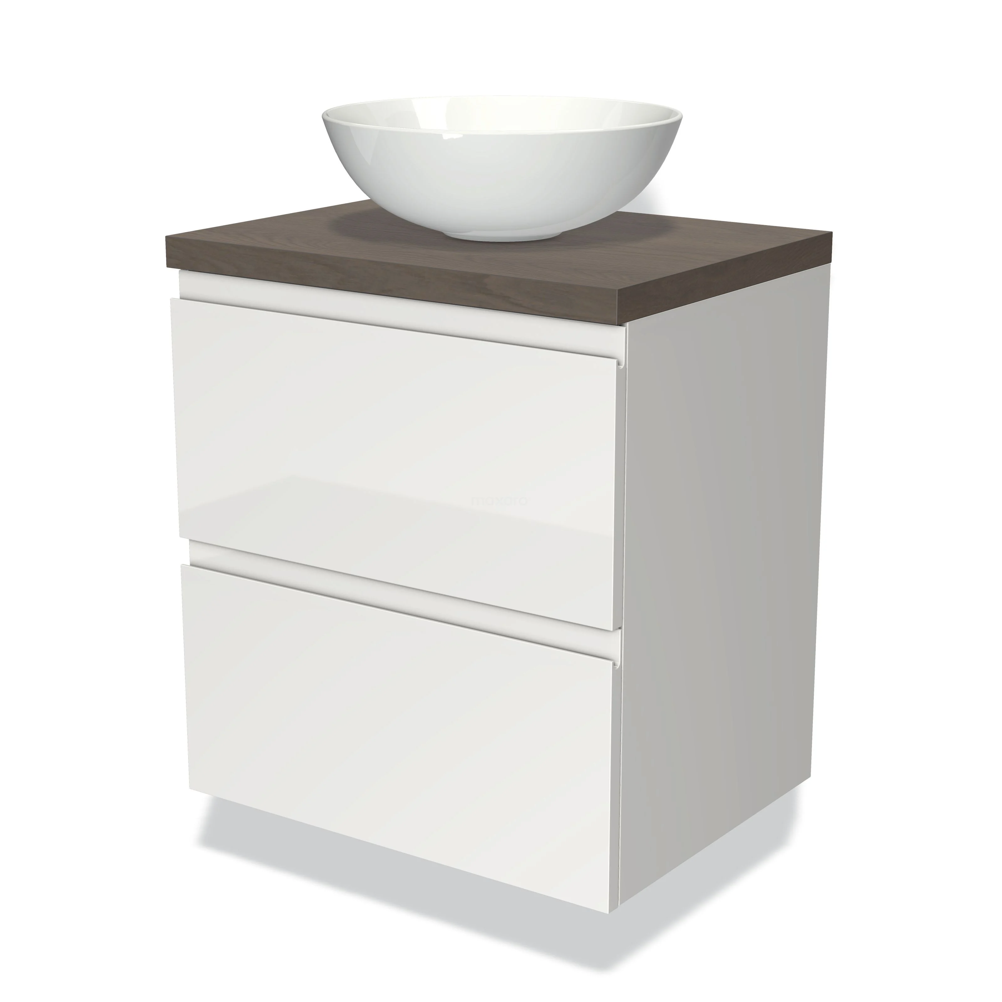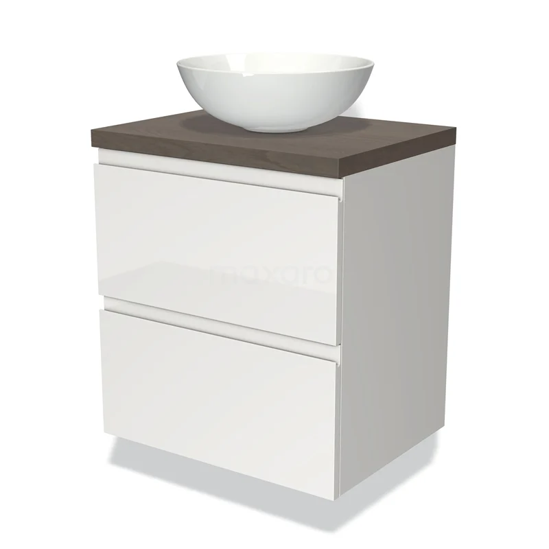 Modulo Plato Badmöbel mit Aufsatzwaschbecken | 60 cm Hochglanz Weiß Grifflos front Dunkelbraune Eiche blatt 2 übereinanderliegende Schubladen