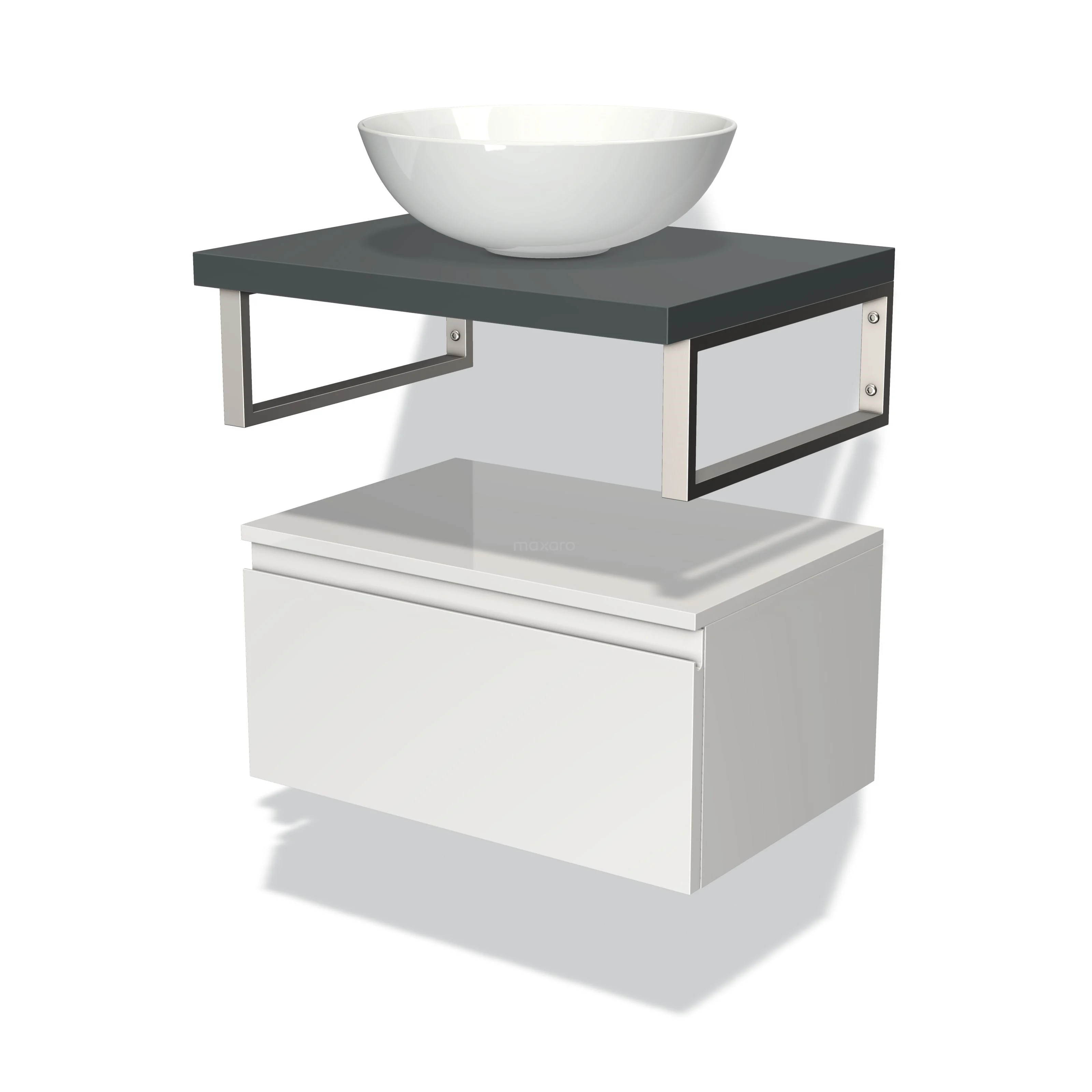 Modulo Plato Badmöbel mit Aufsatzwaschbecken | 60 cm Hochglanz Weiß Grifflos front Dunkelgrau blatt Tief hängend
