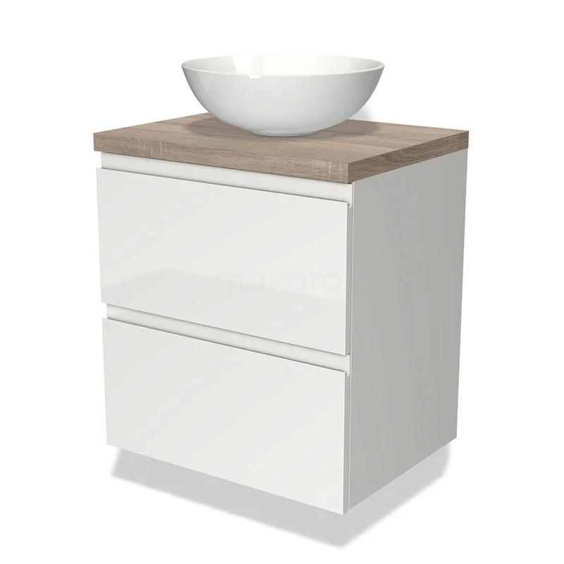 Modulo Plato Badmöbel mit Aufsatzwaschbecken | 60 cm Hochglanz Weiß Grifflos front Eiche blatt 2 übereinanderliegende Schubladen