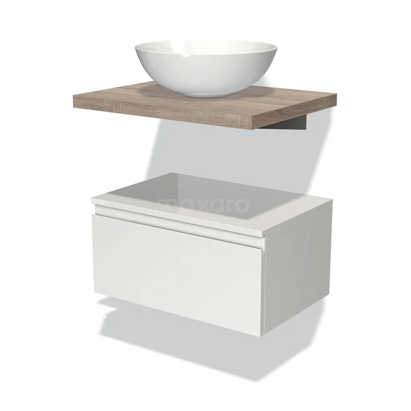 Modulo Plato Badmöbel mit Aufsatzwaschbecken | 60 cm Hochglanz Weiß Grifflos front Eiche blatt Tief hängend