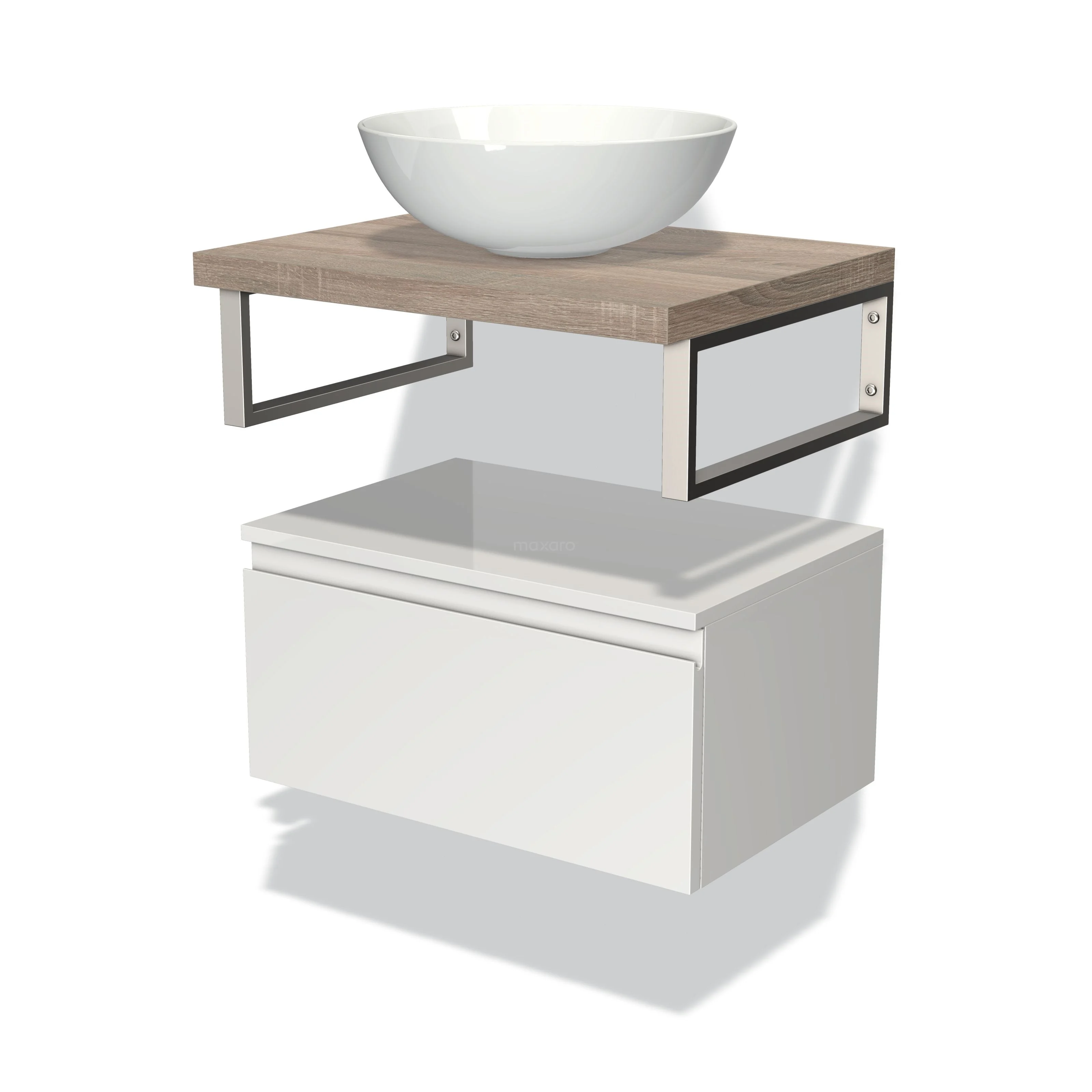 Modulo Plato Badmöbel mit Aufsatzwaschbecken | 60 cm Hochglanz Weiß Grifflos front Eiche blatt Tief hängend
