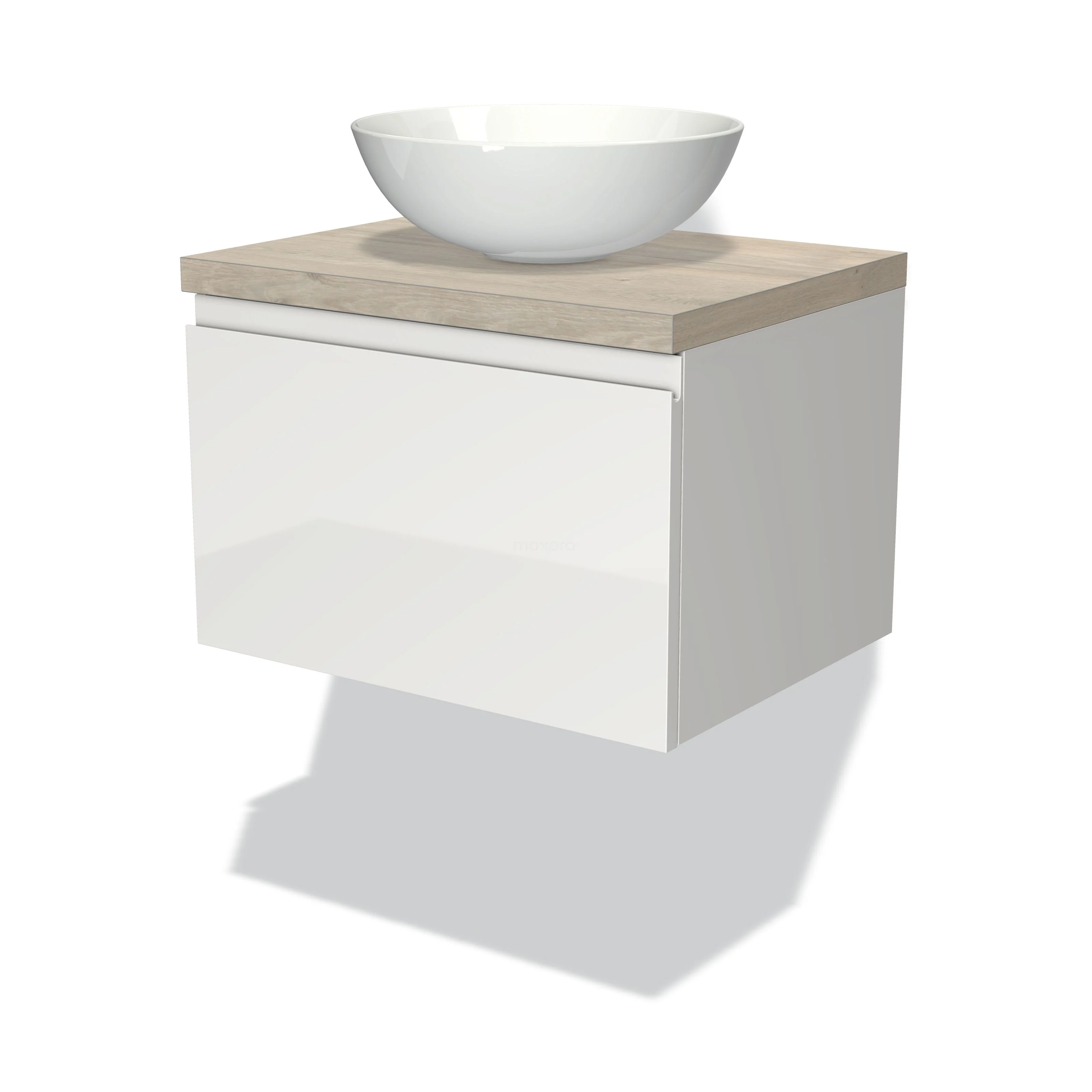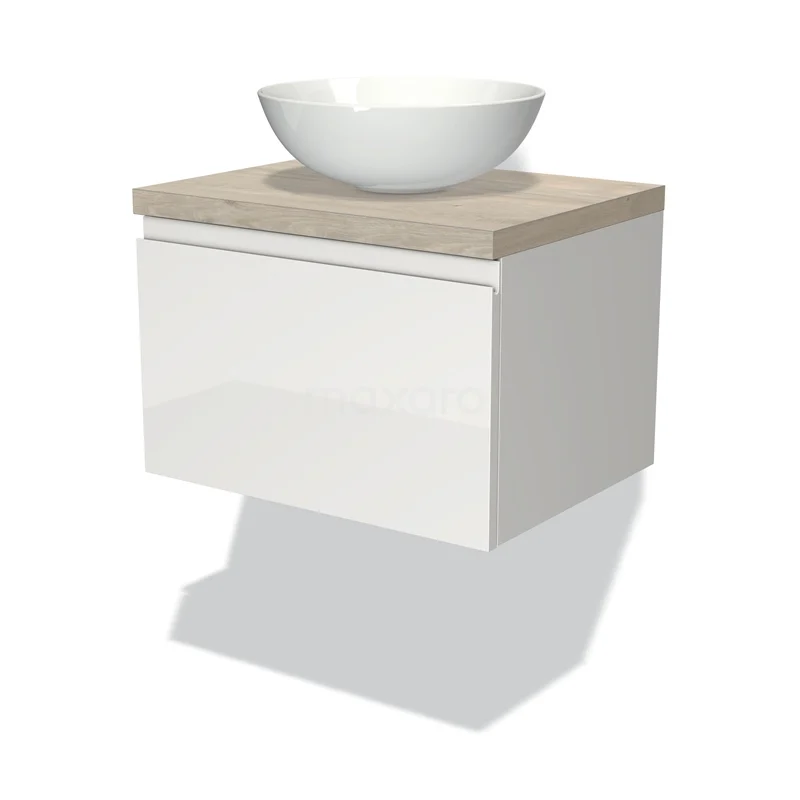Modulo Plato Badmöbel mit Aufsatzwaschbecken | 60 cm Hochglanz Weiß Grifflos front Hellgraue Eiche blatt 1 Schublade